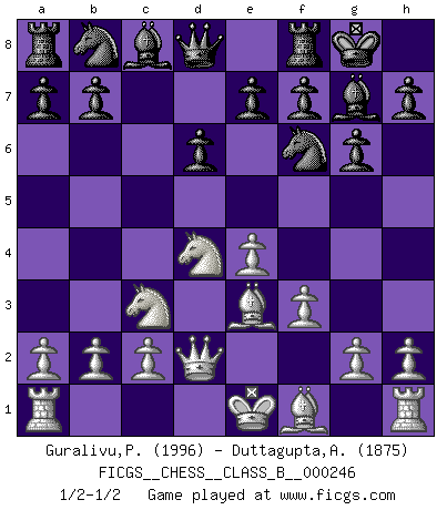 Last move : 1/2-1/2 2016 September 6 21:16:50 [Event "FICGS__CHESS__CLASS_B__000246"] [Site "FICGS"] [Date "2016.09.02"] [Round "1"] [White "Guralivu,Paul"] [Black "Duttagupta,Aniruddha"] [Result "1/2-1/2"] [WhiteElo "1996"] [BlackElo "1875"] 1.e4 c5 2.Nf3 d6 3.d4 cxd4 4.Nxd4 Nf6 5.Nc3 g6 6.Be3 Bg7 7.f3 O-O 8.Qd2 1/2-1/2 Sicilian : Dragon, Yugoslav attack, 7...O-O Kingside Castling by player Black (move 7) This chess game ended in a draw. Follow this game move after move (download)Chess is the art of analysis. (Mikhail Botvinnik) Ein Buch ist ein Spiegel; wenn ein Affe hineinsieht, so kann kein Apostel heraus gucken. (Georg Christoph Lichtenberg) Un jugador que es sorprendido, esta derrotado a medias. (Proverbio) Les échecs, c'est la lutte contre l'erreur. (Johannes Zukertort) The Movers & Shakers of this world are those who play chess in the mornings and go to the disco in the evenings. (Dinesh De Silva)