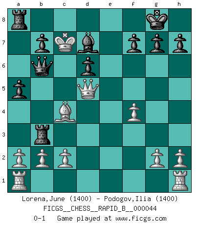 Last move : 0-1 2007 April 11 4:27:29 [Event "FICGS__CHESS__RAPID_B__000044"] [Site "FICGS"] [Date "2007.03.27"] [Round "1"] [White "Lorena,June"] [Black "Podogov,Ilia"] [Result "0-1"] [WhiteElo "1400"] [BlackElo "1400"] 1.Nc3 e5 2.Nf3 Nc6 3.d4 exd4 4.Nxd4 Nxd4 5.Qxd4 Nf6 6.Bf4 d5 7.Nb5 Bd6 8.Nxd6+ cxd6 9.e3 O-O 10.Bd3 Nh5 11.Qxd5 Nxf4 12.exf4 Re8+ 13.Kd2 Qb6 14.Bc4 Qxf2+ 15.Kc3 Re3+ 16.Kb4 a5+ 17.Kb5 Bd7+ 18.Kb6 Rb3+ 19.Kc7 Qb6+ 0-1 Dunst (Sleipner-Heinrichsen) Opening Kingside Castling by player Black (move 9) Player Black won this chess game. Follow this game move after move (download)When you don't know what to play, wait for an idea to come into your opponent's mind. You may be sure that idea will be wrong. (Siegbert Tarrasch) Ohne Fehler kann es keine Brillanz geben. (Emanuel Lasker) Las leyes del Ajedrez no permiten una libre elección: tienes que mover quieras o no. (Emanuel Lasker) Avant la finale, les dieux ont créé le milieu de partie. (Tarrasch) I feel so... helpless. (C-3PO in Star Wars ep.3)