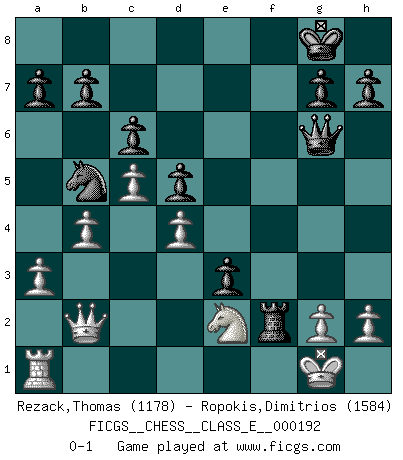 Last move : 0-1 2016 November 15 13:3:15 [Event "FICGS__CHESS__CLASS_E__000192"] [Site "FICGS"] [Date "2016.09.03"] [Round "1"] [White "Rezack,Thomas"] [Black "Ropokis,Dimitrios"] [Result "0-1"] [WhiteElo "1178"] [BlackElo "1584"] 1.e4 e5 2.Nf3 Nf6 3.Nxe5 d6 4.Nf3 Nxe4 5.d4 d5 6.Bd3 Bd6 7.O-O O-O 8.c4 c6 9.Qc2 Na6 10.a3 Bg4 11.Be2 Re8 12.c5 Bc7 13.b4 Qe7 14.Be3 Nxf2 15.Bxf2 Qd7 16.Nc3 Bf4 17.Rfe1 Bf5 18.Qd1 Nc7 19.Bd3 Rxe1+ 20.Qxe1 Bxd3 21.Bg3 Re8 22.Ne5 Bxe5 23.Bxe5 f6 24.Qg3 fxe5 25.Qxd3 e4 26.Qe3 Rf8 27.Ne2 Qf5 28.Ng3 Qg6 29.Ne2 Rf3 30.Qd2 e3 31.Qc3 Nb5 32.Qb2 Rf2 0-1 Petrov : Classical attack, Marshall variation Kingside Castling by player White (move 7) Kingside Castling by player Black (move 7) Player Black won this chess game. Follow this game move after move (download)The passed pawn is a criminal, who should be kept under lock and key. Mild measures, such as police surveillance, are not sufficient. (Nimzovitch) Ich verstehe den Grund nicht, warum die Aufteilung in Frauen und Männer überhaupt im Schach besteht. (Judith Polgar) Un Peón pasado es un criminal, quién debe ser mantenido bajo candado y llave. Leves medidas, tales como vigilancia policiaca, no son suficientes. (Aaron Nimzovich) Mon pion favori sur ma case favorite ! Bronstein en parlant d'un coup de pion en h5 quand il avait les Noirs. Looking at the proliferation of personal web pages on the Net, it looks like very soon everyone on Earth will have 15 megabytes of fame. (M.G. Sriram)