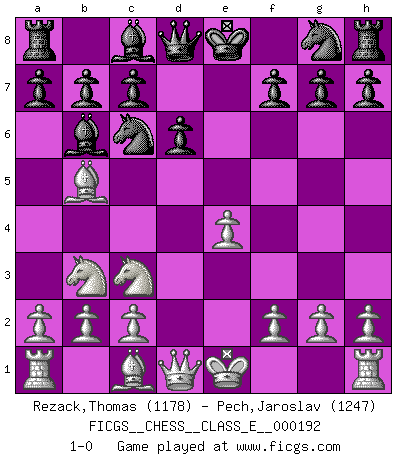 Last move : 1-0 2016 October 20 1:26:37 [Event "FICGS__CHESS__CLASS_E__000192"] [Site "FICGS"] [Date "2016.09.03"] [Round "1"] [White "Rezack,Thomas"] [Black "Pech,Jaroslav"] [Result "1-0"] [WhiteElo "1178"] [BlackElo "1247"] 1.e4 e5 2.Nf3 Nc6 3.d4 exd4 4.Nxd4 Bc5 5.Nb3 Bb6 6.Nc3 d6 7.Bb5 1-0 This chess game has been lost on time (started : 2016.09.03 1:3:41) Scotch : Potter variation Player White won this chess game. Follow this game move after move (download)It is not a move, even the best move that you must seek, but a realizable plan. (Eugene Znosko-Borovsky) Dass jemand wie Surab Asmaiparaschwili, der selbst Elopunkte gekauft hat , Vize-Präsident der Fide werden konnte, sagt schon einges über den Zustand dieser Organisation aus. (Joel Lautier) Entre mas años cumplo, mas valoro los Peones. (Keres) Aidez vos pièces, elles vous aideront. (Paul Morphy) Have no fear of perfection - you'll never reach it. (Salvador Dali)