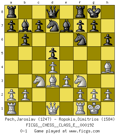 Last move : 0-1 2016 November 7 0:14:31 [Event "FICGS__CHESS__CLASS_E__000192"] [Site "FICGS"] [Date "2016.09.03"] [Round "1"] [White "Pech,Jaroslav"] [Black "Ropokis,Dimitrios"] [Result "0-1"] [WhiteElo "1247"] [BlackElo "1584"] 1.d4 d5 2.c4 e6 3.Nc3 Nf6 4.Bg5 Be7 5.e3 O-O 6.Nf3 h6 7.Bh4 b6 8.cxd5 exd5 9.Bd3 Nbd7 10.O-O Bb7 0-1 QGD : Tartakower (Makagonov-Bondarevsky) system Kingside Castling by player Black (move 5) Kingside Castling by player White (move 10) Player Black won this chess game. Follow this game move after move (download)Chess is mental torture. (Garry Kasparov) Ein Remis kann durch Wiederholung von drei Zügen oder durch einen schlechte Zug erreicht werden. (Savielly Grigorievitsch Tartakower) Todavía soy una víctima del Ajedrez. Tiene toda la belleza del arte y mucho mas. No puede ser comercializado. El Ajedrez es mas puro que el arte en su posición social. (Marcel Duchamp) Aux échecs, les retours au sommet sont rares : les dommages psychologiques consécutifs à une défaite sont trop sévères. (Daily Telegraph) Memory is a complicated thing, a relative to truth, but not its twin. (Barbara Kingsolver, Animal Dreams)