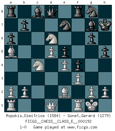 Last move : 1-0 2016 September 7 12:46:8 [Event "FICGS__CHESS__CLASS_E__000192"] [Site "FICGS"] [Date "2016.09.03"] [Round "1"] [White "Ropokis,Dimitrios"] [Black "Gonet,Gerard"] [Result "1-0"] [WhiteElo "1584"] [BlackElo "1279"] 1.d4 Nf6 2.c4 g6 3.Nc3 Bg7 4.e4 d6 5.Be2 O-O 6.Be3 Nc6 7.Nf3 e5 8.d5 Ne7 9.Nd2 c6 10.O-O h5 11.f3 cxd5 12.cxd5 Kh7 13.Nc4 Nfg8 14.Nb5 f5 15.Nbxd6 f4 16.Bd2 a6 17.Ba5 1-0 King's Indian : Semi-Averbakh system Kingside Castling by player Black (move 5) Kingside Castling by player White (move 10) Player White won this chess game. Follow this game move after move (download)In the perfect Chess combination as in a first-rate short story, the whole plot and counter-plot should lead up to a striking finale, the interest not being allayed until the very last moment. (Yates and Winter) Frage: Wie viele Autos haben Sie schon zerstört? - Antwort: Nur zwei. (Loek van Wely) El Rey es una pieza de pelea. ¡Usenlo!. (Wilhelm Steinitz) Un journaliste : 'Vous préférez avoir une dame de plus sur l'échiquier ou au lit ?' Boris Spassky : 'Ca dépend de la position.' The modern world has divided itself into Conservatives and Progressives. The business of Progressives is to go on making mistakes. The business of the Conservatives is to prevent the mistakes from being corrected. (G.K. Chesterton)