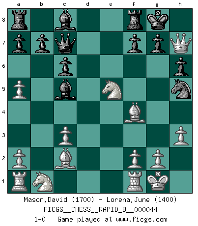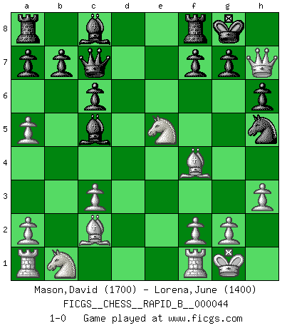 Last move : 1-0 2007 May 9 6:59:34 [Event "FICGS__CHESS__RAPID_B__000044"] [Site "FICGS"] [Date "2007.03.27"] [Round "1"] [White "Mason,David"] [Black "Lorena,June"] [Result "1-0"] [WhiteElo "1700"] [BlackElo "1400"] 1.e4 e5 2.Nf3 Nc6 3.Bc4 h6 4.c3 d6 5.h3 Nf6 6.d3 Na5 7.Bb5+ c6 8.Ba4 Be7 9.Bc2 O-O 10.b4 d5 11.bxa5 dxe4 12.Nxe5 exd3 13.Qxd3 Bc5 14.O-O Qc7 15.Bf4 Nh5 16.Qh7+ 1-0 King's pawn game Kingside Castling by player Black (move 9) Kingside Castling by player White (move 14) Player White won this chess game. Follow this game move after move (download)The beauty of a move lies not in its' appearance but in the thought behind it. (Siegbert Tarrasch) Wenn ich mich einlogge, glauben die Leute gewöhnlich nicht, dass ich es selbst bin und sie fangen an, mir dumme Fragen zu stellen. Und wenn sie es glauben, stellen sie wieder andere dumme Fragen. (Judith Polgar) Yo no le temo a Spassky. Todos saben que yo soy el mejor. Uno no necesita un torneo para probarlo. (Bobby Fischer) Dieu déplace le joueur, et celui-ci la pièce. Quel Dieu derrière Dieu commence donc la trame ? Arturo Perez-Reverte (prix de littérature policière 1993). A person who never made a mistake never tried anything new. (Albert Einstein)