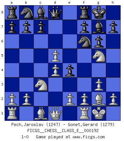 Last move : 1-0 2016 October 13 13:3:19 [Event "FICGS__CHESS__CLASS_E__000192"] [Site "FICGS"] [Date "2016.09.03"] [Round "1"] [White "Pech,Jaroslav"] [Black "Gonet,Gerard"] [Result "1-0"] [WhiteElo "1247"] [BlackElo "1279"] 1.c4 Nf6 2.Nc3 g6 3.Nf3 Bg7 4.g3 O-O 5.Bg2 d6 6.O-O e5 7.d4 e4 8.Ng5 d5 9.cxd5 1-0 English Opening Kingside Castling by player Black (move 4) Kingside Castling by player White (move 6) Player White won this chess game. Follow this game move after move (download)When you absolutely don't know what to do anymore, it is time to panic. (John van der Wiel) Der Vorposten provoziert a) eine Basis für neue Angriffe und b) eine Schwächung der gegnerischen Widerstandskraft in der fraglichen Linie. (Aaron Nimzowitsch) El Ajedrez es parte de la cultura, y si una cultura esta en decadencia, entonces también el Ajedrez declinará. (Mikhail Botvinnik) Je ne crois pas en la psychologie, je crois aux bons coups. (Robert Fischer) Life doesn't imitate art, it imitates bad television. (Woody Allen)