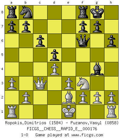 Last move : 1-0 2016 November 10 8:45:44 [Event "FICGS__CHESS__RAPID_E__000176"] [Site "FICGS"] [Date "2016.09.04"] [Round "1"] [White "Ropokis,Dimitrios"] [Black "Puzanov,Vasyl"] [Result "1-0"] [WhiteElo "1584"] [BlackElo "0858"] 1.d4 Nf6 2.c4 e6 3.Nc3 Bb4 4.Qc2 d5 5.Bg5 O-O 6.a3 Bxc3+ 7.Qxc3 h6 8.Bxf6 Qxf6 9.cxd5 exd5 10.e3 c6 11.Nf3 Bg4 12.Be2 1-0 Nimzo-Indian : Classical, Noa variation Kingside Castling by player Black (move 5) Player White won this chess game. Follow this game move after move (download)As one by one I mowed them down, my superiority soon became apparent. (Jose Capablanca) Sitze auf Deine Hände. (Siegbert Tarrasch) No hay precio que no valga la pena por la cabellera del Rey enemigo. (Koblentz) Aux échecs, l'amour-propre est satisfait quand on remporte la victoire, mais il n'y a pas de honte à être battu. (Benjamin Franklin) There are two types of people in this world, good and bad. The good sleep better, but the bad seem to enjoy the waking hours much more. (Woody Allen)