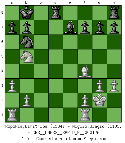 Last move : 1-0 2016 November 26 12:41:19 [Event "FICGS__CHESS__RAPID_E__000176"] [Site "FICGS"] [Date "2016.09.04"] [Round "1"] [White "Ropokis,Dimitrios"] [Black "Niglio,Biagio"] [Result "1-0"] [WhiteElo "1584"] [BlackElo "1193"] 1.d4 d5 2.c4 e5 3.dxe5 d4 4.Nf3 Nc6 5.a3 Bg4 6.Qb3 Rb8 7.g3 Nge7 8.Bg2 Ng6 9.h3 Be6 10.e3 Ngxe5 11.Nxe5 Nxe5 12.Qb5+ Nd7 13.exd4 c6 14.Qb3 Nb6 15.d5 cxd5 16.cxd5 Bxd5 17.Qb5+ Qd7 18.Qxd7+ Kxd7 19.O-O Bxg2 20.Kxg2 Rd8 21.Nc3 Be7 22.Be3 Kc7 23.Nb5+ Kb8 24.Bf4+ 1-0 QGD : Albin counter-gambit Kingside Castling by player White (move 19) Player White won this chess game. Follow this game move after move (download)Chess is like life. (Boris Spassky) Ich organisiere ein großes Turnier, was mich etwa 120000 Dollar kostet. Ich denke, das ist das erste Mal in der Schachgeschichte, daß ein Schachgroßmeister auch als Mäzen auftritt. (Miguel Najdorf) Las piezas de Ajedrez son los bloques del alfabeto que moldean los pensamientos; y esos pensamientos, aunque hagan un diseño visual en el tablero, expresan abstractamente su belleza como un poema. (Marcel Duchamp) J'ai toujours senti une vague pitié pour l'homme qui ne connaît rien aux échecs, tout comme j'en aurais pour un homme ignorant de l'amour. Les Echecs, comme la musique ou comme l'amour, ont le pouvoir de rendre heureux. (Siegbert Tarrasch) Every now and then a man's mind is stretched by a new idea and never shrinks back to its former dimensions. (Oliver Wendell Holmes, Sr.)