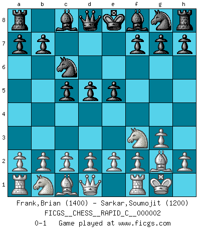 Last move : 0-1 2006 July 8 1:7:15 [Event "FICGS__CHESS__RAPID_C__000002"] [Site "FICGS"] [Date "2006.05.31"] [Round "1"] [White "Frank,Brian"] [Black "Sarkar,Soumojit"] [Result "0-1"] [WhiteElo "1400"] [BlackElo "1200"] 1.Nf3 c5 2.g3 Nc6 3.Bg2 d5 4.O-O e5 0-1 This chess game has been lost on time (started : 2006.05.31 6:58:20) Reti Opening Kingside Castling by player White (move 4) Player Black won this chess game. Follow this game move after move (download)I have added these principles to the law: get the Knights into action before both Bishops are developed. (Emanuel Lasker) Man braucht nicht immer den besten Zug zu spielen: Ein Zug muß aktiv, unternehmungslustig, korrekt und schön sein. (David Bronstein) No todos los artistas son jugadores de Ajedrez, pero todos los jugadores de Ajedrez son artistas. (Marcel Duchamp) Aux échecs, l'amour-propre est satisfait quand on remporte la victoire, mais il n'y a pas de honte à être battu. (Benjamin Franklin) Yoga is 99% practice and 1% knowledge. (Sri Krishna Pattabhi Jois)