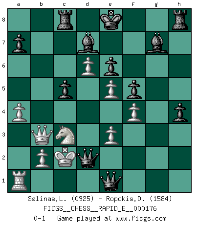 Last move : 0-1 2016 December 3 18:4:56 [Event "FICGS__CHESS__RAPID_E__000176"] [Site "FICGS"] [Date "2016.09.04"] [Round "1"] [White "Salinas,Loreva"] [Black "Ropokis,Dimitrios"] [Result "0-1"] [WhiteElo "0925"] [BlackElo "1584"] 1.Nf3 d5 2.c3 c5 3.Qa4+ Bd7 4.Qf4 Nf6 5.Ne5 Nc6 6.d4 e6 7.e3 Nxe5 8.dxe5 Ne4 9.a4 g5 10.Qg4 h5 11.Qf3 g4 12.Qd1 Qg5 13.f4 Qh4+ 14.g3 Nxg3 15.Rg1 Ne4 16.Rg3 Nxg3 17.hxg3 Qxg3+ 18.Kd2 h4 19.Qb3 Qf2+ 20.Be2 g3 21.Qxb7 Rc8 22.Qb3 Bg7 23.c4 g2 24.cxd5 g1Q 25.d6 Qg1e1+ 26.Kc2 Qf2xe2+ 27.Bd2 f5 28.Nc3 Qe2xd2+ 0-1 Reti Opening Promotion Queen by player Black (move 24) Player Black won this chess game. Follow this game move after move (download)In Chess, just as in life, today's bliss may be tomorrow's poison. (Assaic) In der Schule lernt man nichts. Es ist nur Zeitverschwendung. (Robert James Fischer) Vive, pierde y aprende al observar a tu oponente como ganar. (Amber Steenbock) Toutes choses étant égales, c'est la conviction qui gagne. Alliée à une volonté de vaincre, elle sert de détonateur, suscite des idées, disperse les doutes et aide à penser clairement. (Robert Fischer) This is where the fun begins. (Anakin Skywalker in Star Wars ep.3)