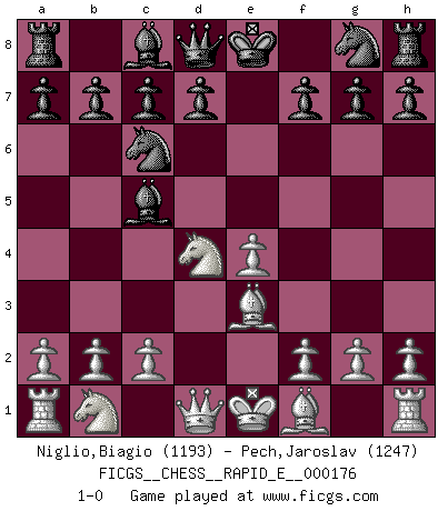 Last move : 1-0 2016 October 23 1:48:0 [Event "FICGS__CHESS__RAPID_E__000176"] [Site "FICGS"] [Date "2016.09.04"] [Round "1"] [White "Niglio,Biagio"] [Black "Pech,Jaroslav"] [Result "1-0"] [WhiteElo "1193"] [BlackElo "1247"] 1.e4 e5 2.Nf3 Nc6 3.d4 exd4 4.Nxd4 Bc5 5.Be3 1-0 This chess game has been lost on time (started : 2016.09.04 19:16:10) Scotch game Player White won this chess game. Follow this game move after move (download)There's never before been a Chess player with such a thorough knowledge of the intricacies of the game and such an absolutely indomitable will to win. I think Bobby is the greatest player that ever lived. (Lisa Lane) Obendrein hat der FIDE-Präsident den Revolutionsführer Gaddafi zum »Großmeister« ernannt, am Ende der WM. Das ist lächerlich! (Joel Lautier) Dios mío, Bobby Fischer juega tan simple. (Alexei Suetin) Il (Jacob Murray) ne joue pas pour le bon coup, mais pour le meilleur. (Eloi Relange) He who is a good ruler must first have been ruled. (Aristotle)