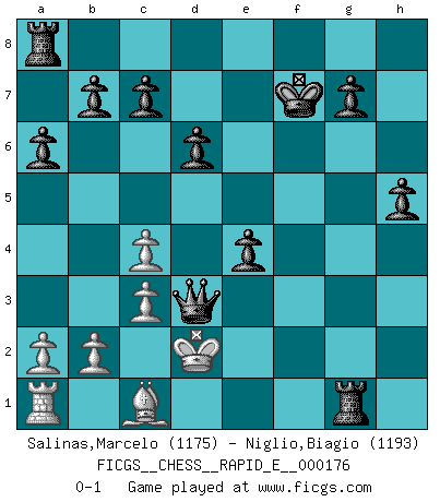 Last move : 0-1 2016 December 21 19:26:50 [Event "FICGS__CHESS__RAPID_E__000176"] [Site "FICGS"] [Date "2016.09.04"] [Round "1"] [White "Salinas,Marcelo"] [Black "Niglio,Biagio"] [Result "0-1"] [WhiteElo "1175"] [BlackElo "1193"] 1.Na3 e5 2.e4 Nf6 3.Bc4 Nxe4 4.Qh5 Qf6 5.Nf3 Nc6 6.Nb5 Bd6 7.d3 a6 8.Nxd6+ Nxd6 9.Ng5 Nxc4 10.dxc4 d6 11.O-O Bf5 12.Qd1 h6 13.Nf3 O-O 14.c3 Bg4 15.Re1 Rfe8 16.h3 Bh5 17.g4 Bg6 18.h4 e4 19.Nd4 Nxd4 20.Qxd4 Qxh4 21.Qd1 h5 22.g5 Bf5 23.Kf1 Bg4 24.f3 Bxf3 25.Re2 Qh1+ 26.Kf2 Qxd1 27.Re3 Re5 28.g6 Rg5 29.gxf7+ Kxf7 30.Rxf3+ Qxf3+ 31.Ke1 Rg1+ 32.Kd2 Qd3+ 0-1 Durkin's attack Kingside Castling by player White (move 11) Kingside Castling by player Black (move 13) Player Black won this chess game. Follow this game move after move (download)A sacrifice is best refuted by accepting it. (Wilhelm Steinitz) Schach ist gnadenlos. Du mußt bereit sein zu töten. (Nigel Short) En la vida, como en el Ajedrez, los Peones propios obstruyen nuestro camino. La gran fortuna de un hombre, su comodidad, placer, hijos, libros, que deberían ayudarle a ganar, con mucha frecuencia lo ponen en Jaque Mate. (Charles Buxton) Si rien de grave n'est détecté lors de l'analyse d'une position, on joue alors le coup. Seconde règle de Blumenfeld. Beta. Software undergoes beta testing shortly before it's released. Beta is latin for still doesn't work. (Anonymous)