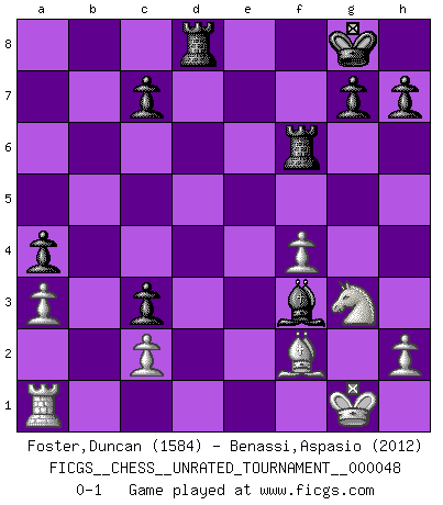Last move : 0-1 2017 January 2 22:47:55 [Event "FICGS__CHESS__UNRATED_TOURNAMENT__000048"] [Site "FICGS"] [Date "2016.09.07"] [Round "1"] [White "Foster,Duncan"] [Black "Benassi,Aspasio"] [Result "0-1"] [WhiteElo "1584"] [BlackElo "2012"] 1.e4 e5 2.Nf3 Nc6 3.d4 exd4 4.Bc4 Nf6 5.e5 d5 6.Bb5 Ne4 7.Nxd4 Bd7 8.Bxc6 bxc6 9.O-O Bc5 10.f3 Ng5 11.Be3 Bb6 12.f4 Ne4 13.Nd2 Nxd2 14.Qxd2 c5 15.Nb3 d4 16.Bf2 a5 17.Nc1 a4 18.a3 O-O 19.Ne2 Bc6 20.Ng3 Qd5 21.Be1 f6 22.exf6 c4 23.Kh1 Rxf6 24.Rf3 c3 25.bxc3 Qxf3 26.gxf3 Bxf3+ 27.Kg1 dxc3 28.Qf2 Bxf2+ 29.Bxf2 Rd8 0-1 Scotch gambit : Dubois-Reti defense Kingside Castling by player White (move 9) Kingside Castling by player Black (move 18) Player Black won this chess game. Follow this game move after move (download)You can only get good at Chess if you love the game. (Bobby Fischer) Schach ist eine Sache der genauen Beurteilung, wann man zuschlagen und wann man sich ducken muss. (Robert James Fischer) El Ajedrez, como la música, como el amor, tiene el poder de hacer feliz a la gente. (Siegbert Tarrasch) Aux échecs, l'amour-propre est satisfait quand on remporte la victoire, mais il n'y a pas de honte à être battu. (Benjamin Franklin) Warrior pose battles inner weakness and wins focus. You see that there is no war within you. You're on your own side, and you are your own strength. (Terri Guillemets)