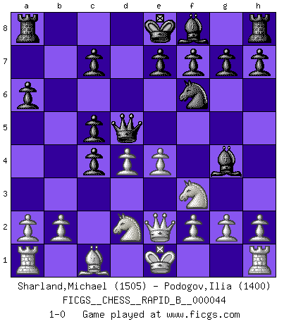 Last move : 1-0 2007 May 20 10:12:1 [Event "FICGS__CHESS__RAPID_B__000044"] [Site "FICGS"] [Date "2007.03.27"] [Round "1"] [White "Sharland,Michael"] [Black "Podogov,Ilia"] [Result "1-0"] [WhiteElo "1505"] [BlackElo "1400"] 1.d4 d5 2.Nf3 Nf6 3.e3 Nc6 4.Bd3 Bg4 5.Bb5 a6 6.Bxc6+ bxc6 7.c4 dxc4 8.Nbd2 Qd5 9.Qe2 c5 10.e4 1-0 This chess game has been lost on time (started : 2007.03.27 5:42:57) Queen's pawn game Player White won this chess game. Follow this game move after move (download)It is not enough to be a good player... you must also play well. (Siegbert Tarrasch) Modernes Schach sorgt sich zuviel um Dinge wie Bauernstruktur usw. Vergessen Sie das, Schachmatt beendet das Spiel! (Nigel Short) Ser exitoso en el Ajedrez te permite descubrir tu propia personalidad. Eso es lo que deseo para los niños de mi clase. (Saudin Robovic) Les échecs c'est le défi de l'alpiniste, toujours plus haut, prêt à tout pour monter à l'assaut du Roi ennemi. Les échecs, c'est de la musique en mouvement, un ballet majestueux pour les yeux. C'est de la poésie composée par les fantômes du passé qui au même titre que Rimbaud ou Verlaine méritent notre admiration. Les échecs, c'est de la peinture ou le moindre mouvement modifie le tableau pour en faire un Picasso ou un Van Gogh. Les échecs, c'est tout et rien, c'est la vie et la mort. Jjulie33 sur le forum de France-Echecs. Hello Thibault, if I have had a plan (and I had one, I hope), I have forgotten it during the last week... - Hello Heinz-Georg. What do you mean a plan ? (Anonymous players, during a Big Chess game)