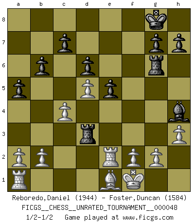 Last move : 1/2-1/2 2017 January 8 15:20:56 [Event "FICGS__CHESS__UNRATED_TOURNAMENT__000048"] [Site "FICGS"] [Date "2016.09.07"] [Round "1"] [White "Reboredo,Daniel"] [Black "Foster,Duncan"] [Result "1/2-1/2"] [WhiteElo "1944"] [BlackElo "1584"] 1.e4 e5 2.Nf3 Nf6 3.Nxe5 d6 4.Nf3 Nxe4 5.Nc3 Nxc3 6.dxc3 Nc6 7.Bc4 Be7 8.O-O O-O 9.h3 Be6 10.Bxe6 fxe6 11.Re1 Qd7 12.Nd4 e5 13.Nxc6 Qxc6 14.Qd3 Rf6 15.c4 Raf8 16.Be3 Rg6 17.Qd5+ Qxd5 18.cxd5 a5 19.c4 b6 20.Bd2 Bh4 21.Re2 Rf3 22.Kf1 Rd3 23.Be1 1/2-1/2 Petrov : Nimzovich attack Kingside Castling by player White (move 8) Kingside Castling by player Black (move 8) This chess game ended in a draw. Follow this game move after move (download)We must make sure that Chess will not be like a dead language, very interesting, but for a very small group. (Sytze Faber) Der 70jährige Viktor Kortschnoi: Die Rentenanstalt wollte mich zwingen in Rente zu gehen. Meine Frau erhält jetzt eine Pension- und ich zahle weiter in die Rentenkasse ein! (Viktor Kortschnoi) Todo lo que importa ante el tablero de Ajedrez son buenas jugadas. (Bobby Fischer) Il n'y a pas eu de défaite parce que je ne crois pas que cet ordinateur ait jamais existé. IBM a triché en refusant d'imprimer les modes de recherche de la machine. C'est évident, pendant le match, des coups décisifs ont été joués par des êtres humains. Aujourd'hui, les meilleurs spécialistes en informatique ne peuvent toujours pas expliquer comment Deep-Blue a pu jouer contre la logique des ordinateurs. IBM a gagné une guerre de communication, mais ils sont incapables de prouver que l'ordinateur a gagné tout seul. (Garry Kasparov) Rules and bones are meant to be broken. (Anonymous)