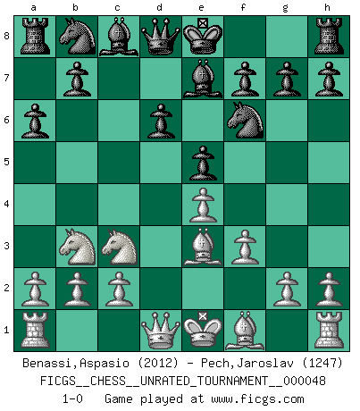 Last move : 1-0 2016 October 21 1:32:52 [Event "FICGS__CHESS__UNRATED_TOURNAMENT__000048"] [Site "FICGS"] [Date "2016.09.07"] [Round "1"] [White "Benassi,Aspasio"] [Black "Pech,Jaroslav"] [Result "1-0"] [WhiteElo "2012"] [BlackElo "1247"] 1.e4 c5 2.Nf3 d6 3.d4 cxd4 4.Nxd4 Nf6 5.Nc3 a6 6.Be3 e5 7.Nb3 Be7 8.f3 1-0 This chess game has been lost on time (started : 2016.09.07 20:42:55) Sicilian : Najdorf, Byrne (English) attack Player White won this chess game. Follow this game move after move (download)Chess is a terrible game. If you have no center, your opponent has a freer position. If you do have a center, then you really have something to worry about ! (Siegbert Tarrasch) Die meiste Zeit treffe ich auf Gegner, die meine Enkel sein könnten. Ich bin da, um ihnen zu zeigen, dass sie von mir noch einiges lernen können. (Viktor Kortschnoi) Vive, pierde y aprende al observar a tu oponente como ganar. (Amber Steenbock) Les échecs c'est le défi de l'alpiniste, toujours plus haut, prêt à tout pour monter à l'assaut du Roi ennemi. Les échecs, c'est de la musique en mouvement, un ballet majestueux pour les yeux. C'est de la poésie composée par les fantômes du passé qui au même titre que Rimbaud ou Verlaine méritent notre admiration. Les échecs, c'est de la peinture ou le moindre mouvement modifie le tableau pour en faire un Picasso ou un Van Gogh. Les échecs, c'est tout et rien, c'est la vie et la mort. Jjulie33 sur le forum de France-Echecs. Computer Science is no more about computers than astronomy is about telescopes. (Edsger W. Dijkstra)