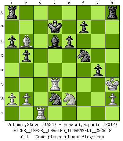 Last move : 0-1 2016 November 12 11:59:7 [Event "FICGS__CHESS__UNRATED_TOURNAMENT__000048"] [Site "FICGS"] [Date "2016.09.07"] [Round "1"] [White "Vollmer,Steve"] [Black "Benassi,Aspasio"] [Result "0-1"] [WhiteElo "1634"] [BlackElo "2012"] 1.d4 d5 2.c4 dxc4 3.e3 Nf6 4.Bxc4 c5 5.Nf3 cxd4 6.Nc3 Qc7 7.Qxd4 Nc6 8.Qh4 Bg4 9.O-O Bxf3 10.gxf3 e6 11.e4 a6 12.Bf4 Nd4 13.Be2 Qc4 14.Rfe1 Qxe2 15.Nxe2 Nxf3+ 16.Kf1 Nxh4 17.Rac1 Nxe4 18.Rc7 Nf3 19.Rec1 g5 20.Be3 b5 21.Kg2 Nh4+ 22.Kh3 Bd6 23.R7c6 Nf5 24.Bb6 Kd7 25.f3 Nd2 26.R6c3 h5 27.Rd3 g4+ 28.fxg4 hxg4+ 0-1 Queen's gambit accepted Kingside Castling by player White (move 9) Player Black won this chess game. Follow this game move after move (download)Best by test: 1. e4 (Bobby Fischer) Sie führen leise Selbstgespräche, schlürfen lautstark ihre Getränke, schmatzen hörbar beim Essen, blasen ihrem Gegenüber Rauch in die Augen, niesen ihm ins Gesicht, starren ihn unverwandt an, bis er sich unter ihren Blicken windet, rutschen ständig auf ihrem Stuhl hin und her, rülpsen und bohren in der Nase. (Anonymous) Botvinnik trató de alejar el misterio referente al Ajedrez, siempre relacionandolo a situaciones de la vida diaria. Solía llamar al Ajedrez un problema inexacto típico, similar a aquellos en que la gente tiene siempre que resolver a cada día. (Garry Kasparov) Les Echecs sont et restent toujours un combat, un combat intégral comme la boxe, la lutte ou un autre sport, et où il doit y avoir un vainqueur et un vaincu. (Joseph Emil Diemer) 98% of all statistics are made up. (Author unknown)