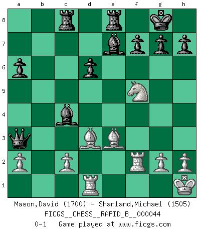 Last move : 0-1 2007 April 26 15:11:50 [Event "FICGS__CHESS__RAPID_B__000044"] [Site "FICGS"] [Date "2007.03.27"] [Round "1"] [White "Mason,David"] [Black "Sharland,Michael"] [Result "0-1"] [WhiteElo "1700"] [BlackElo "1505"] 1.e4 c5 2.Nf3 d6 3.d4 cxd4 4.Nxd4 Nf6 5.Nc3 a6 6.Be2 e6 7.O-O Be7 8.f4 O-O 9.Kh1 Qc7 10.Nf3 Nbd7 11.Be3 b5 12.f5 b4 13.fxe6 bxc3 14.exd7 Bxd7 15.bxc3 Nxe4 16.c4 Nc3 17.Bd3 Nxd1 18.Raxd1 Be6 19.Nd2 Qa5 20.Nb3 Qa3 21.Rf2 Rac8 22.Nd4 Bxc4 23.Nf5 Rfe8 0-1 Sicilian : Najdorf, Opovcensky variation Kingside Castling by player White (move 7) Kingside Castling by player Black (move 8) Player Black won this chess game. Follow this game move after move (download)Methodical thinking is of more use in Chess than inspiration. (C. J. S. Purdy) Der Traum, für den ich lebe, ist der von einem freien Russland. Viele mögen sagen: Russland hat doch ein Parlament, einen gewählten Präsidenten. Aber ich spüre, dass in meiner Heimat die Angst wiederkehrt. Eine Angst, sich frei zu äußern, bestimmte Dinge zu tun (Garry Kasparov) Yo jugué Ajedrez con el y a veces le pude haber ganado solo que siempre devuelve su última jugada y juega la partida de manera diferente. (Mark Twain) C'est la seule position que je connaisse où les deux camps sont mals. Propos prêtés à V. Anand. To steal ideas from one person is plagiarism. To steal from many is research. (Unknown)