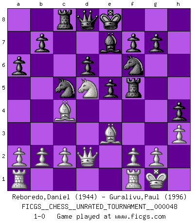 Last move : 1-0 2016 December 25 9:20:4 [Event "FICGS__CHESS__UNRATED_TOURNAMENT__000048"] [Site "FICGS"] [Date "2016.09.07"] [Round "1"] [White "Reboredo,Daniel"] [Black "Guralivu,Paul"] [Result "1-0"] [WhiteElo "1944"] [BlackElo "1996"] 1.e4 c5 2.Nf3 d6 3.d4 cxd4 4.Nxd4 Nf6 5.Nc3 a6 6.h3 e5 7.Nde2 h5 8.Bg5 Be7 9.Ng3 h4 10.Nf5 Bxf5 11.exf5 Nbd7 12.Bc4 Rc8 13.Bb3 Rh5 14.Qd2 Nc5 15.O-O Ng8 16.Be3 Nf6 17.Bc4 Rxf5 18.Nd5 1-0 This chess game has been lost on time (started : 2016.09.07 20:42:55) Sicilian : Najdorf, Adams attack Kingside Castling by player White (move 15) Player White won this chess game. Follow this game move after move (download)We cannot resist the fascination of sacrifice, since a passion for sacrifices is part of a Chessplayer's nature. (Rudolf Spielman) Wer nie einen Fehler gemacht hat, hat nie etwas Neues ausprobiert. (Albert Einstein) El Ajedrez es un juego de pelea el cual es puramente intelectual e incluye la suerte. (Richard Reti) Pour moi, les échecs ne sont pas un jeu mais un art. (Alexandre Alekhine) Wisdom begins at the end. (Daniel Webster)