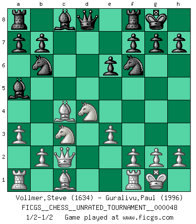 Last move : 1/2-1/2 2016 September 13 23:13:30 [Event "FICGS__CHESS__UNRATED_TOURNAMENT__000048"] [Site "FICGS"] [Date "2016.09.07"] [Round "1"] [White "Vollmer,Steve"] [Black "Guralivu,Paul"] [Result "1/2-1/2"] [WhiteElo "1634"] [BlackElo "1996"] 1.d4 Nf6 2.c4 e6 3.Nf3 d5 4.Nc3 Bb4 5.e3 O-O 6.Bd3 c5 7.O-O dxc4 8.Bxc4 Nbd7 9.a3 Ba5 10.Qc2 cxd4 11.Nxd4 Nb6 1/2-1/2 Queen's pawn game Kingside Castling by player Black (move 5) Kingside Castling by player White (move 7) This chess game ended in a draw. Follow this game move after move (download)I guess a certain amount of temperament is expected of Chess geniuses. (Ron Gross) Schach verlangt totale Konzentration. (Robert James Fischer) Ayuda a tus piezas para que ellas te puedan ayudar. (Paul Morphy) Je menace de comprendre la position. (Anonyme) Life is the sum of all your choices. (Albert Camus)