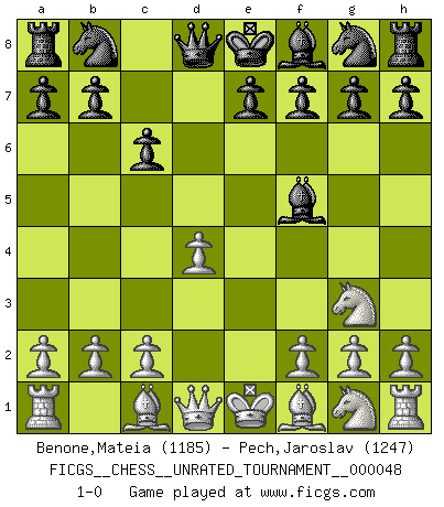 Last move : 1-0 2016 October 27 14:15:32 [Event "FICGS__CHESS__UNRATED_TOURNAMENT__000048"] [Site "FICGS"] [Date "2016.09.07"] [Round "1"] [White "Benone,Mateia"] [Black "Pech,Jaroslav"] [Result "1-0"] [WhiteElo "1185"] [BlackElo "1247"] 1.e4 c6 2.d4 d5 3.Nc3 dxe4 4.Nxe4 Bf5 5.Ng3 1-0 This chess game has been lost on time (started : 2016.09.07 20:42:55) Caro-Kann : Classical variation Player White won this chess game. Follow this game move after move (download)Of all my Russian books, the defense contains and diffuses the greatest 'warmth' which may seem odd seeing how supremely abstract Chess is supposed to be. (Vladimir Nabokov) Die westlichen Werte sind eine Sprache, welche die Putin-Administration nicht versteht. (Garry Kasparov) Cuando estes solo, cuando te sientas un extraño en el mundo, juega al Ajedrez. Esto levantará tu espiritu y será tu consejero de guerra. (Aristóteles) Plusieurs personnes se sont demandées comment Tal faisait pour gagner... En fait, c'est très simple ! Il met ses pièces au centre de l'échiquier et les sacrifie quelque part ! (David Bronstein) The existence of forgetting has never been proved: We only know that some things don't come to mind when we want them. (Friedrich Nietzsche)