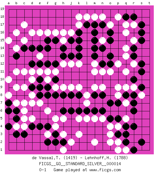 Last move : 0-1 2017 May 6 1:7:15 [Event "FICGS__GO__STANDARD_SILVER__000014"] [Site "FICGS"] [Date "2016.09.11"] [Round "2"] [Black "de Vassal,Thibault"] [White "Lehnhoff,Heinz-Georg"] [Result "0-1"] [Rating 1 "1419"] [Rating 2 "1788"] 1.q4 d16 2.d4 q16 3.r14 o17 4.s16 r17 5.r10 o3 6.p3 o4 7.r6 k3 8.g3 c4 9.c3 c5 10.b3 d5 11.e4 c9 12.c14 c15 13.d14 f16 14.f14 h15 15.c10 d10 16.d9 c11 17.b10 b11 18.c8 b9 19.b8 a10 20.e9 f10 21.e10 e11 22.d12 d11 23.h14 j14 24.h13 d8 25.e8 d7 26.g15 g16 27.j15 h16 28.k14 j16 29.k15 f6 30.f9 g9 31.g10 f11 32.g8 h9 33.h8 j9 34.h6 h5 35.j6 f3 36.f4 e7 37.f8 j12 38.j13 g5 39.l6 h3 40.g2 q5 41.r4 k12 42.k16 q14 43.n6 m5 44.m6 q13 45.r13 r12 46.q12 q11 47.s12 p12 48.s11 e13 49.e14 k17 50.l17 k18 51.m16 n15 52.m15 k5 53.k6 m9 54.p5 p2 55.o5 l5 56.q2 p9 57.m13 m12 58.k13 m18 59.e12 p4 60.q3 n5 61.p7 q7 62.q8 p8 63.o7 q9 64.r8 r9 65.s17 c17 66.b15 s8 67.r7 g4 68.h2 j2 69.f2 n13 70.m14 r15 71.s15 o2 72.n14 b16 73.n12 n11 74.o13 m11 75.s9 b14 76.b13 a15 77.a6 b7 78.a7 a8 79.b6 c7 80.b5 b4 81.a4 c6 82.r18 q17 83.q18 p18 84.o15 l18 85.m17 h12 86.g12 g11 87.f12 m2 88.n17 n18 89.o12 o11 90.o16 q1 91.r1 p1 92.s2 h1 93.n8 n9 94.m8 l8 95.k8 k9 96.j8 l7 97.f15 e16 0-1 Here are the names of the openings (joseki) played in the four corners : Corner q16 : q16 r14 Hoshi (Hwajeom, Seongjeom, Xingwei`) 4-4 Point. The star or hoshi (4-4) point, emphasizing influence at the potential expense of territory. Ikken Kakari (Hankan Keolch'im, Yi Gua`jiao~, 1-Space Low Approach). Black 2 is the standard approach move to the 4-4. Corner q4 : q4 o3 Hoshi (Hwajeom, Seongjeom, Xingwei`) 4-4 Point. The star or hoshi (4-4) point, emphasizing influence at the potential expense of territory. Ikken Kakari (Hankan Keolch'im, Yi Gua`jiao~, 1-Space Low Approach). White 2 is the standard approach move to the 4-4. Corner d16 : d16 c14 Hoshi (Hwajeom, Seongjeom, Xingwei`) 4-4 Point. The star or hoshi (4-4) point, emphasizing influence at the potential expense of territory. Ikken Kakari (Hankan Keolch'im, Yi Gua`jiao~, 1-Space Low Approach). Black 2 is the standard approach move to the 4-4. Player White won this Go (weiqi, baduk) game. Follow this game move after move (download)The strong player plays straight, the weak diagonally. (Anonymous) I feel so... helpless. (C-3PO in Star Wars ep.3)