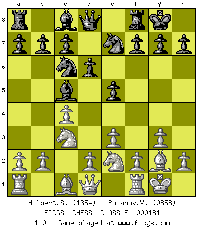 Last move : 1-0 2016 November 8 9:18:27 [Event "FICGS__CHESS__CLASS_F__000181"] [Site "FICGS"] [Date "2016.09.11"] [Round "1"] [White "Hilbert,Stephan J."] [Black "Puzanov,Vasyl"] [Result "1-0"] [WhiteElo "1354"] [BlackElo "0858"] 1.c4 e5 2.Nc3 Nc6 3.g3 Bc5 4.Bg2 Nge7 5.e3 O-O 6.Nge2 d6 7.O-O 1-0 This chess game has been lost on time (started : 2016.09.11 23:49:2) English : Sicilian Reversed Kingside Castling by player Black (move 5) Kingside Castling by player White (move 7) Player White won this chess game. Follow this game move after move (download)Mistrust is the most necessary characteristic of the Chess player. (Siegbert Tarrasch) Über die Verhaftung Bobby Fischers: Warum es die Bush-Administration für nötig befindet einen 61 Jahre alten Mann zu hetzten, der für niemanden ausser sich selbste eine Gefahr darstellt ist ein Rätsel. (Nigel Short) En la vida, como en el Ajedrez, los Peones propios obstruyen nuestro camino. La gran fortuna de un hombre, su comodidad, placer, hijos, libros, que deberían ayudarle a ganar, con mucha frecuencia lo ponen en Jaque Mate. (Charles Buxton) Le profane ne songe pas à la somme de jouissance dont il se prive, qui méconnaît ce jeu aux ressources aussi variées que passionnantes. (Jean-Marie Jeanton-Lamarche) A bird doesn't sing because it has an answer, it sings because it has a song. (Maya Angelou)