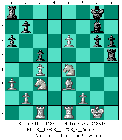 Last move : 1-0 2016 November 20 22:32:29 [Event "FICGS__CHESS__CLASS_F__000181"] [Site "FICGS"] [Date "2016.09.11"] [Round "1"] [White "Benone,Mateia"] [Black "Hilbert,Stephan J."] [Result "1-0"] [WhiteElo "1185"] [BlackElo "1354"] 1.e4 g6 2.d4 Bg7 3.Nf3 d6 4.c4 Nf6 5.Nc3 O-O 6.Be2 c6 7.O-O Nbd7 8.Bg5 a6 9.Rc1 e5 10.d5 c5 11.a3 h6 12.Be3 Ng4 13.Bd2 Nb6 14.h3 Nf6 15.Be3 Nh5 16.Re1 f5 17.exf5 Bxf5 18.g4 e4 19.Nd2 Qh4 20.gxf5 Rxf5 21.Bg4 R5f8 22.Qb3 Nf4 23.Qxb6 Nxh3+ 24.Bxh3 Qxh3 25.Qxd6 Rf5 26.Ndxe4 Rh5 27.Qe6+ Qxe6 28.dxe6 1-0 Robatsch (Modern) defense Kingside Castling by player Black (move 5) Kingside Castling by player White (move 7) Player White won this chess game. Follow this game move after move (download)Weak points or holes in the opponent's position must be occupied by pieces not Pawns. (Siegbert Tarrasch) Zu meiner Zeit war ein 20 jähriger ein junger Spieler, heute ist er ein Veteran. (Garry Kasparov) Si pudieramos observar el interior de la cabeza de un jugador de Ajedrez, encontraríamos ahí un mundo lleno de sentimientos, imágenes, ideas, emoción y pasión. (Alfred Binet) Ne tendez aucun piège pour le plaisir ! Ne jouez rien dans l'espoir que l'adversaire réagisse de façon stupide ! Prenez toujours pour acquis que l'adversaire va trouver le meilleur coup ! Ne jouez jamais de coup dans l'espoir que l'adversaire ne voie pas la menace ! Chacun de vos coups doit améliorer la position d'une façon ou d'une autre. There are three kinds of lies: lies, damned lies and statistics. (Mark Twain)