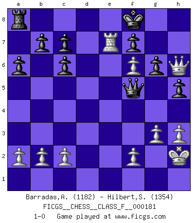 Last move : 1-0 2016 October 3 12:28:2 [Event "FICGS__CHESS__CLASS_F__000181"] [Site "FICGS"] [Date "2016.09.11"] [Round "1"] [White "Barradas,Anderson"] [Black "Hilbert,Stephan J."] [Result "1-0"] [WhiteElo "1182"] [BlackElo "1354"] 1.e4 e5 2.Nf3 Nc6 3.Bb5 a6 4.Bxc6 dxc6 5.Nc3 Bd6 6.O-O Bg4 7.h3 Be6 8.d4 exd4 9.Nxd4 Bc4 10.Re1 Ne7 11.Nf5 O-O 12.Qg4 Nxf5 13.exf5 Re8 14.Rxe8+ Qxe8 15.Bh6 Bf8 16.f6 Be6 17.Qg3 g6 18.Bxf8 Kxf8 19.Ne4 Bf5 20.Qh4 h5 21.Re1 Bxe4 22.Rxe4 Qd8 23.Re7 Qd1+ 24.Kh2 Qd6+ 25.g3 Qc5 26.Qf4 Qf5 27.Qh6+ 1-0 Ruy Lopez : Exchange, Keres variation Kingside Castling by player White (move 6) Kingside Castling by player Black (move 11) Player White won this chess game. Follow this game move after move (download)Chess, like love, like music, has the power to make people happy. (Siegbert Tarrasch) Man braucht nicht immer den besten Zug zu spielen: Ein Zug muß aktiv, unternehmungslustig, korrekt und schön sein. (David Bronstein) Ciertamente el estado mental actual de Bobby Fischer es una tragedia. Uno de los mas grandes jugadores de Ajedrez del mundo -el orgullo y pena del Ajedrez Americano. (Frank Brady) J'ai toujours senti une vague pitié pour l'homme qui ne connaît rien aux échecs, tout comme j'en aurais pour un homme ignorant de l'amour. Les Echecs, comme la musique ou comme l'amour, ont le pouvoir de rendre heureux. (Siegbert Tarrasch) Life is like a play: it's not the length but the excellence of the acting that matters. (Seneca)