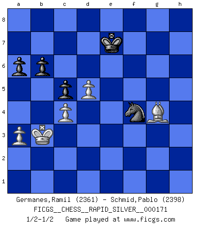 Last move : 1/2-1/2 2017 March 28 0:49:19 [Event "FICGS__CHESS__RAPID_SILVER__000171"] [Site "FICGS"] [Date "2016.09.14"] [Round "1"] [White "Germanes,Ramil"] [Black "Schmid,Pablo"] [Result "1/2-1/2"] [WhiteElo "2361"] [BlackElo "2398"] 1.d4 Nf6 2.c4 g6 3.Nc3 Bg7 4.e4 d6 5.Be2 O-O 6.Be3 e5 7.d5 Na6 8.Nf3 Ng4 9.Bg5 f6 10.Bh4 c5 11.a3 Bd7 12.O-O Qe8 13.Nb5 Qe7 14.Rb1 b6 15.b4 Nh6 16.h3 Nf7 17.Nh2 Bh6 18.Bd3 Bg5 19.Bxg5 fxg5 20.Ng4 h5 21.Ne3 g4 22.hxg4 Ng5 23.Be2 Rf4 24.gxh5 Raf8 25.hxg6 Rh4 26.Nf5 Bxf5 27.exf5 Qf6 28.Bg4 Qh8 29.f3 e4 30.Rb3 exf3 31.Bxf3 Rh1+ 32.Kf2 Qh4+ 33.Ke3 Re8+ 34.Kd3 Rxf1 35.Qxf1 Re1 36.g3 Qxg3 37.Qg2 Qf4 38.Be2 Nb8 39.Qg4 Qf2 40.Nc3 Rg1 41.Nd1 Qe1 42.Qf4 Nd7 43.Nc3 Ne5+ 44.Kc2 Ne4 45.f6 Nxg6 46.f7+ Kg7 47.Qe3 Nxc3 48.Qxc3+ Qxc3+ 49.Kxc3 Rg3+ 50.Kc2 Rxb3 51.Kxb3 Nf4 52.bxc5 dxc5 53.Bg4 Kxf7 54.Ka4 a6 55.Kb3 Ke7 1/2-1/2 King's Indian : Semi-Averbakh system Kingside Castling by player Black (move 5) Kingside Castling by player White (move 12) 10 pieces endgame at move 53 : White KBPPP , Black KNPPP WHITE : King + 1 Bishop 3 Pawns BLACK : King + 1 Knight 3 Pawns This chess game ended in a draw. Follow this game move after move (download)Chess is a fighting game which is purely intellectual and includes chance. (Richard Reti) Im Leben werden Partien nie so unstrittig gewonnen wie im Spiel (Emanuel Lasker) Por esta medida (el intervalo entre Fischer y sus contemporaneos), yo le considero el mas grande campeón mundial. (Garry Kasparov) L'ordinateur a tué l'originalité. Il n'y a plus guère d'aventures sur l'échiquier. (Jacob Murray) Better than a thousand days of diligent study is one day with a great teacher. (Japanese proverb)
