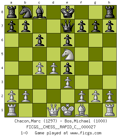 Last move : 1-0 2007 May 5 13:55:25 [Event "FICGS__CHESS__RAPID_C__000027"] [Site "FICGS"] [Date "2007.03.27"] [Round "1"] [White "Chacon,Marc"] [Black "Bos,Michael"] [Result "1-0"] [WhiteElo "1297"] [BlackElo "1000"] 1.d4 d5 2.c4 Nf6 3.Nf3 e6 4.Bg5 c6 5.Nc3 Be7 6.e3 Ne4 7.Bxe7 Qxe7 8.Nxe4 dxe4 9.Ne5 1-0 This chess game has been lost on time (started : 2007.03.27 10:42:51) QGD : Marshall defense Player White won this chess game. Follow this game move after move (download)Chess is life. (Bobby Fischer) Stil? Ich habe keinen Stil! (Anatoly Karpov) Un buen sacrificio es aquel que aunque no sea necesariamente sólido, deja a tu oponente aturdido y confuso. (Rudolph Spielmann) La victoire dans une partie d'Echecs appartient la plupart du temps à celui qui voit un peu plus loin que l'adversaire. (Lasker) There's always a bigger fish. (Qui-Gon Jinn in Star Wars ep.1)