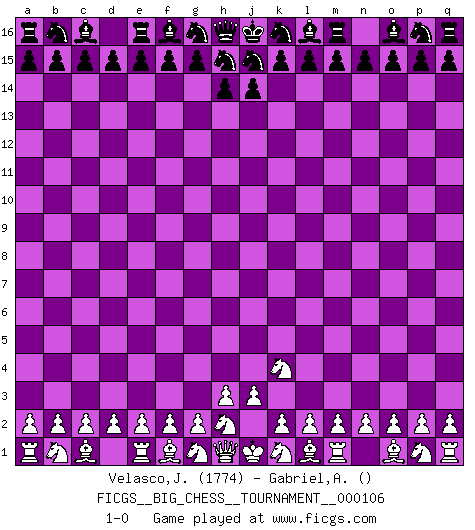 Last move : 1-0 2016 October 18 0:57:30 [Event "FICGS__BIG_CHESS__TOURNAMENT__000106"] [Site "FICGS"] [Date "2016.09.17"] [Round "1"] [White "Velasco,Jose Maria"] [Black "Gabriel,Alexandru"] [Result "1-0"] [WhiteElo "1774"] [BlackElo ""] 1.j2-k4 1-0 This big chess game has been lost on time (started : 2016.09.17 4:20:22) Follow this game move after move (download)We cannot resist the fascination of sacrifice, since a passion for sacrifices is part of a Chessplayer's nature. (Rudolf Spielman) Schach ist das Spiel, das die Verrückten gesund hält. (Albert Einstein) Los finales de Peón son del Ajedrez lo que el cesped es del Golf. (Cecil Purdy) En blitz, le Cavalier l'emporte sur le Fou. (Vlastimil Hort) If things go wrong, don't go with them. (Roger Babson)