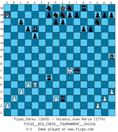 Last move : 0-1 2016 November 10 13:11:50 [Event "FICGS__BIG_CHESS__TOURNAMENT__000106"] [Site "FICGS"] [Date "2016.09.17"] [Round "1"] [White "Pipac,Darko"] [Black "Velasco,Jose Maria"] [Result "0-1"] [WhiteElo "1643"] [BlackElo "1774"] 1.j2-k4 j15-k13 2.h2-g4 h16-o10 3.m2-m4 d15-d13 4.p2-p3 n15-n13 5.e2-e4 o16-d6 6.k1-h2 e15-e13 7.g1-f3 m15-m13 8.d2-d4 f16-b12 9.l1-m2 l16-p12 10.e4-e5 d6-f8 11.c2-c3 o10-j10 12.h1-j2 m16-m14 13.o1-p2 e13-e12 14.l2-l3 e16-e13 15.e1-e4 j10-c10 16.p1-o3 e13-j13 17.b1-d2 m14-l14 18.d2-c4 p16-o14 19.c4-d6 c10-l10 20.f1-d3 c16-k9 21.j2-k3 f8-d6 22.e5-d6 k9-e4 23.d3-e4 l10-e4 24.k3-b11 b16-c14 25.j1-j2 l14-l11 26.b11-d9 l11-d11 27.d9-a6 a16-e16 28.m1-e1 e4-g6 29.c1-f4 g6-n6 30.j2-j1 n6-n2 31.m2-n3 n2-f9 32.j1-j2 f9-f4 33.a6-c6 q16-m16 34.c6-e4 f4-d6 35.n3-o4 c14-e13 36.b2-b3 c15-c14 37.c3-c4 e16-e14 38.d4-d5 e14-g14 39.p2-o1 d11-j11 40.o1-l4 p12-k7 41.l4-n2 d6-n6 42.n2-l4 n6-l4 43.h2-k3 k7-o3 44.q1-n1 o3-j8 45.e4-f4 j8-g6 46.f3-h4 g6-n12 47.g4-j5 b12-j5 48.n1-n5 j5-p11 49.q2-q4 j13-h13 50.n5-l5 l4-o7 51.j2-h2 p11-k6 52.l5-h5 h13-j13 53.e1-e5 k6-d12 54.k4-m3 o7-n8 55.a1-n1 n8-g8 56.o4-e13 d12-e13 57.f4-f15 k13-j15 58.g2-g3 j11-f11 59.f15-b15 f11-f2 60.h4-g2 g8-g3 61.h2-j2 g3-g2 62.j2-k1 g2-j2 63.k1-l2 j13-j3 64.b15-a15 j2-k3 65.l2-m2 f2-k2 66.m3-k2 k3-k2 67.m2-n3 k2-l3 68.n3-n4 l3-n1 69.n4-m5 n12-q9 70.m5-l5 n1-l3 71.l5-k6 l3-m4 72.h5-l5 g14-g6 73.k6-k7 m4-m7 74.l5-l7 m7-l7 0-1 Follow this game move after move (download)It is no time to be playing Chess when the house is on fire. (Italian Proverb) Moralische Siege zählen nicht. (Savielly Grigorievitsch Tartakower) Cuando me preguntan: -¿Cual es el secreto que te hace hacer mejores movidas que tus oponentes?, Yo respondo: Me da gusto que me pregunten eso, porque, como veran, hay una simple razón. Yo pienso mis propias movidas y dejo a mi oponente que el piense las suyas. (Alexander Alekhine) Les Echecs ne sont pas pour les âmes timides. Ils requièrent un homme entier, qui ne s'arrête pas aveuglément à ce qui a été déjà établi, mais qui tente individuellement de sonder les profondeurs du jeu. (W. Steinitz) How many people work in NATO Headquarters ? - About half of them. (Dirk Stikker, NATO general secretary)
