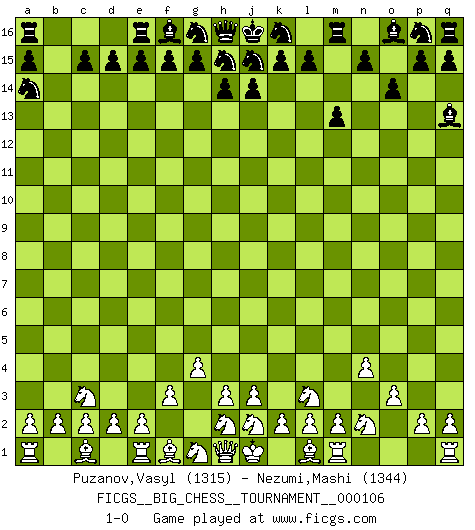 Last move : 1-0 2016 December 1 19:19:18 [Event "FICGS__BIG_CHESS__TOURNAMENT__000106"] [Site "FICGS"] [Date "2016.09.17"] [Round "1"] [White "Puzanov,Vasyl"] [Black "Nezumi,Mashi"] [Result "1-0"] [WhiteElo "1315"] [BlackElo "1344"] 1.k1-l3 b15-b13 2.o2-o3 o15-o14 3.n2-n4 m15-m13 4.o1-b13 l16-q11 5.p1-n2 c16-a14 6.b13-a14 b16-a14 7.b1-c3 q11-p12 8.f2-f3 p12-q13 9.g2-g4 1-0 This big chess game has been lost on time (started : 2016.09.17 4:20:22) Follow this game move after move (download)Chess makes man wiser and clear-sighted. (Vladimir Putin) Es ist peinlich, dass ich nie Weltmeister wurde. Es wäre leicht, Leonid Breschnjew als Ursache vorzuschieben, dessen Apparat den Vorzeigekommunisten Anatoli Karpow in allem unterstützte. Aber Garri Kasparow zum Beispiel, der ebenfalls von den Sowjets unerwünscht war, hat trotz der Widerstände den WM-Titel erobert. (Viktor Kortschnoi) Si no le temes a Spassky, entonces elimino el elemento del dinero. (Jim Slater) Karpov est une pièce de musée. (Garry Kasparov) I feel so... helpless. (C-3PO in Star Wars ep.3)