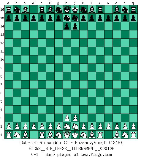 Last move : 0-1 2016 October 17 12:43:54 [Event "FICGS__BIG_CHESS__TOURNAMENT__000106"] [Site "FICGS"] [Date "2016.09.17"] [Round "1"] [White "Gabriel,Alexandru"] [Black "Puzanov,Vasyl"] [Result "0-1"] [WhiteElo ""] [BlackElo "1315"] 0-1 This big chess game has been lost on time (started : 2016.09.17 4:20:22) Follow this game move after move (download)I guess a certain amount of temperament is expected of Chess geniuses. (Ron Gross) Es ist im Leben wie im Schachspiel. Wir entwerfen einen Plan, dieser bleibt jedoch bedingt durch das, was im Schachspiel dem Gegner, im Leben dem Schicksal zu tun belieben wird. (Arthur Schopenhauer) Un sacrificio se refuta mucho mejor al aceptarlo. (Wilhelm Steinitz) Je menace de comprendre la position. (Anonyme) A person who never made a mistake never tried anything new. (Albert Einstein)