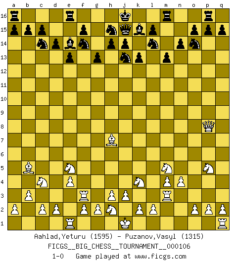 Last move : 1-0 2016 December 24 9:15:21 [Event "FICGS__BIG_CHESS__TOURNAMENT__000106"] [Site "FICGS"] [Date "2016.09.17"] [Round "1"] [White "Aahlad,Yeturu"] [Black "Puzanov,Vasyl"] [Result "1-0"] [WhiteElo "1595"] [BlackElo "1315"] 1.e2-e4 b16-c14 2.m2-m4 d15-d14 3.b2-b3 p16-o14 4.c1-a3 n15-n14 5.j2-k4 o16-a3 6.b1-a3 e15-e13 7.h1-p8 q16-p16 8.l1-p5 f16-e15 9.f1-b5 k16-l14 10.e1-e3 g16-f14 11.n2-n4 k15-k13 12.o1-h7 l16-k15 13.p1-o3 c16-e14 14.k1-l3 f14-g16 15.m1-m3 e15-p5 16.o3-p5 g16-f14 17.g1-f3 g15-g13 18.f3-e5 m15-m13 19.e3-f3 j15-g14 20.a3-c4 g14-j13 21.l3-m5 h16-j15 22.a1-e1 1-0 This big chess game has been lost on time (started : 2016.09.17 4:20:22) Follow this game move after move (download)Mistrust is the most necessary characteristic of the Chess player. (Siegbert Tarrasch) Schach ist gnadenlos. Du mußt bereit sein zu töten. (Nigel Short) Hay jugadores fuertes y personas amables y yo soy un jugador fuerte. (Bobby Fischer) Tout change constamment, y compris dans le monde des Echecs. (Botvinnik) If you lose the game you should win the analysis! (Proverb)