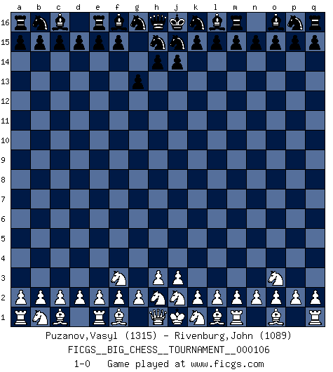 Last move : 1-0 2016 November 9 15:23:16 [Event "FICGS__BIG_CHESS__TOURNAMENT__000106"] [Site "FICGS"] [Date "2016.09.17"] [Round "1"] [White "Puzanov,Vasyl"] [Black "Rivenburg,John"] [Result "1-0"] [WhiteElo "1315"] [BlackElo "1089"] 1.g1-f3 g15-g13 2.p1-o3 1-0 This big chess game has been lost on time (started : 2016.09.17 4:20:22) Follow this game move after move (download)Of all my Russian books, the defense contains and diffuses the greatest 'warmth' which may seem odd seeing how supremely abstract Chess is supposed to be. (Vladimir Nabokov) Die westlichen Werte sind eine Sprache, welche die Putin-Administration nicht versteht. (Garry Kasparov) El jugador táctico sabe que hacer cuando hay algo que hacer; mientras que el estratega sabe que hacer cuando no hay nada que hacer. (Gerald Abrahams) On peut tirer plus d'utilité d'une partie perdue que de 100 parties gagnées. (Capablanca) Hello Thibault, if I have had a plan (and I had one, I hope), I have forgotten it during the last week... - Hello Heinz-Georg. What do you mean a plan ? (Anonymous players, during a Big Chess game)