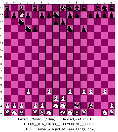 Last move : 0-1 2016 November 10 3:27:15 [Event "FICGS__BIG_CHESS__TOURNAMENT__000106"] [Site "FICGS"] [Date "2016.09.17"] [Round "1"] [White "Nezumi,Mashi"] [Black "Aahlad,Yeturu"] [Result "0-1"] [WhiteElo "1344"] [BlackElo "1595"] 1.p2-p4 m15-m13 2.g2-g4 e15-e13 3.k2-k4 j15-k13 4.d2-d4 h16-o10 5.h1-c6 o10-o2 6.c6-c15 b16-c14 7.n2-n4 g16-f14 8.m2-m4 o2-l2 9.o1-n2 f14-d13 0-1 This big chess game has been lost on time (started : 2016.09.17 4:20:22) Follow this game move after move (download)The passed pawn is a criminal, who should be kept under lock and key. Mild measures, such as police surveillance, are not sufficient. (Nimzovitch) Es ist nicht das erste mal, dass sich die FIDE dem Arabischen Geld gebeugt hat (über die FIDE WM 2004 in Lybien). (Larry Evans) Las ideas audaces son como las piezas del Ajedrez que avanzan hacia adelante. Ellas pueden ser vencidas, pero también pueden iniciar una partida victoriosa. (Goethe) Nous vivons dans un monde échiquéen : chaque jour qui passe est un défi à relever. (Philosophe Sasha) A woman without a man is like a fish without a bicycle. (Gloria Steinem)