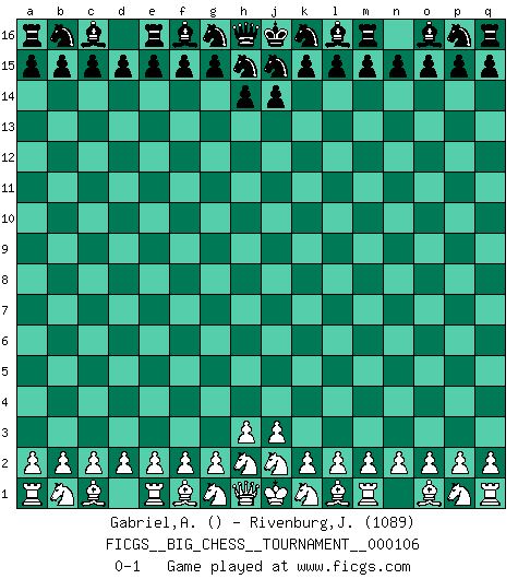 Last move : 0-1 2016 October 17 12:43:54 [Event "FICGS__BIG_CHESS__TOURNAMENT__000106"] [Site "FICGS"] [Date "2016.09.17"] [Round "1"] [White "Gabriel,Alexandru"] [Black "Rivenburg,John"] [Result "0-1"] [WhiteElo ""] [BlackElo "1089"] 0-1 This big chess game has been lost on time (started : 2016.09.17 4:20:22) Follow this game move after move (download)There is only one thing Fischer does in Chess without pleasure: to lose ! (Boris Spassky) Der Partner hat auch seine Existenzberechtigung. (Savielly Grigorievitsch Tartakower) El pensamiento metódico es mas útil en el Ajedrez que la inspiración. (C. J. S. Purdy) Lorsque vous vous retrouvez devant une position atroce, ne tendez pas un ultime piège dérisoire avec l'intention d'abandonner si l'adversaire le déjoue ! Faites-vous plutôt un devoir de résister comme si votre vie en dépendait. Jouez le coup qui vous déplairait au centuple si vous étiez dans la peau de votre tortionnaire ! I've never seen so many men wasted so badly. (Blondie in The Good, The Bad and The Ugly)