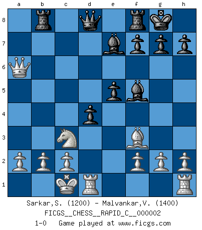 Last move : 1-0 2006 August 15 5:50:41 [Event "FICGS__CHESS__RAPID_C__000002"] [Site "FICGS"] [Date "2006.05.31"] [Round "1"] [White "Sarkar,Soumojit"] [Black "Malvankar,Vikrant"] [Result "1-0"] [WhiteElo "1200"] [BlackElo "1400"] 1.e4 c5 2.Nf3 Nc6 3.d4 cxd4 4.Nxd4 Nf6 5.Nc3 e6 6.Nxc6 bxc6 7.Be2 d5 8.exd5 cxd5 9.Qd4 Bd6 10.Nb5 e5 11.Qa4 O-O 12.Bg5 Bf5 13.O-O-O Be7 14.Qb3 a6 15.Bxf6 Bxf6 16.Nc3 d4 17.Bf3 Rb8 18.Qa3 Be7 19.Qxa6 1-0 This chess game has been lost on time (started : 2006.05.31 6:58:20) Sicilian defense Kingside Castling by player Black (move 11) Queenside Castling by player White (move 13) Player White won this chess game. Follow this game move after move (download)The stomach is an essential part of the Chess master. (Bent Larsen) Der 70jährige Viktor Kortschnoi: Die Rentenanstalt wollte mich zwingen in Rente zu gehen. Meine Frau erhält jetzt eine Pension- und ich zahle weiter in die Rentenkasse ein! (Viktor Kortschnoi) Ayuda a tus piezas para que ellas te puedan ayudar. (Paul Morphy) Il n'y a pas eu de défaite parce que je ne crois pas que cet ordinateur ait jamais existé. IBM a triché en refusant d'imprimer les modes de recherche de la machine. C'est évident, pendant le match, des coups décisifs ont été joués par des êtres humains. Aujourd'hui, les meilleurs spécialistes en informatique ne peuvent toujours pas expliquer comment Deep-Blue a pu jouer contre la logique des ordinateurs. IBM a gagné une guerre de communication, mais ils sont incapables de prouver que l'ordinateur a gagné tout seul. (Garry Kasparov) It is the aim of the modern school, not to treat every position according to one general law, but according to the principle inherent in the position. (Richard Reti)