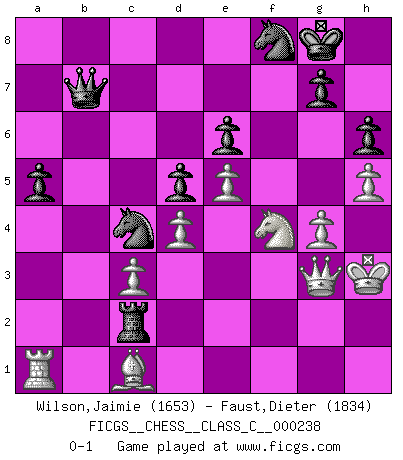 Last move : 0-1 2017 July 23 19:13:54 [Event "FICGS__CHESS__CLASS_C__000238"] [Site "FICGS"] [Date "2016.09.17"] [Round "1"] [White "Wilson,Jaimie"] [Black "Faust,Dieter"] [Result "0-1"] [WhiteElo "1653"] [BlackElo "1834"] 1.e4 e6 2.d4 d5 3.Nc3 Bb4 4.e5 c5 5.a3 Bxc3+ 6.bxc3 Qc7 7.Qg4 f5 8.Qg3 cxd4 9.cxd4 Ne7 10.Bd2 O-O 11.Bd3 b6 12.Ne2 Ba6 13.Bxa6 Nxa6 14.Nf4 Qd7 15.O-O Rac8 16.c3 Rc7 17.h4 Nb8 18.h5 h6 19.a4 Nbc6 20.Bc1 Rfc8 21.Ba3 Na5 22.Bb4 Nc4 23.Rfd1 Nc6 24.Qg6 Re8 25.Ra2 Rb7 26.Kh2 a5 27.Ba3 Nd8 28.Bc1 Qf7 29.Qg3 Qd7 30.Qg6 Nf7 31.Nd3 Qe7 32.Qg3 Ng5 33.f3 b5 34.axb5 Rxb5 35.Bf4 Reb8 36.Nc5 Rb1 37.Ra1 Rxd1 38.Rxd1 Kh8 39.Ra1 Nh7 40.Bc1 Nf8 41.Qf2 Kg8 42.g4 fxg4 43.fxg4 Nd7 44.Nd3 Rb3 45.Qe1 Qf7 46.Nf4 Nf8 47.Kg2 Qb7 48.Qg3 Rb2+ 49.Kh3 Rc2 0-1 French : Winawer, Classical variation Kingside Castling by player Black (move 10) Kingside Castling by player White (move 15) Player Black won this chess game. Follow this game move after move (download)White lost because he failed to remember the right continuation and had to think up the moves himself. (Siegbert Tarrasch) Frage des Reporters: -Welche besonderen Umstände rechtfertigen das Anhalten der Uhren während einer Turnierpartie? Antwort: -Einen Fotographen zu strangulieren. (Siegbert Tarrasch) Cuando tengo las piezas blancas, yo gano porque soy blanco; Cuando tengo las piezas negras, yo gano porque soy Bogolyubov. (Bogolyubov) Comme les marins qui ont mille raisons différentes d'aller en mer, les joueurs d'échecs en ont tout autant avant de s'installer devant une table et jouer... (Vincent Bertignac, philosophe) I take risks, sometimes patients die, but not taking risks causes more patients to die. So I guess my biggest problem is I've been cursed with the ability to do the math. (Gregory House, House M.D.)