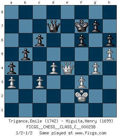 Last move : 1/2-1/2 2017 March 30 8:0:19 [Event "FICGS__CHESS__CLASS_C__000238"] [Site "FICGS"] [Date "2016.09.17"] [Round "1"] [White "Trigance,Emile"] [Black "Higuita,Henry"] [Result "1/2-1/2"] [WhiteElo "1742"] [BlackElo "1699"] 1.d4 d5 2.c4 e6 3.Nc3 Nc6 4.Nf3 h6 5.e3 Nf6 6.Bd3 Be7 7.a3 b6 8.cxd5 exd5 9.Bb5 Bd7 10.Qe2 O-O 11.O-O Bd6 12.Re1 Ne7 13.Bxd7 Qxd7 14.e4 dxe4 15.Nxe4 Nxe4 16.Qxe4 Rfe8 17.Ne5 Qe6 18.Bd2 Bxe5 19.Qxe5 Qd7 20.Bc3 Ng6 21.Qg3 Rxe1+ 22.Rxe1 Rc8 23.h4 Qf5 24.f3 c6 25.Re4 Qd5 26.Qe1 a5 27.g3 Qf5 28.Re8+ Kh7 29.Rxc8 Qxc8 30.Qe4 Kh8 31.Kg2 Qd7 32.h5 Ne7 33.g4 Nd5 34.Qe5 f6 35.Qe4 Nxc3 36.bxc3 b5 37.Qe2 a4 38.Qe4 Kg8 39.Kf2 Kf7 40.Qg6+ Kg8 41.Qe4 Kf7 1/2-1/2 QGD : 3.Nc3 Kingside Castling by player Black (move 10) Kingside Castling by player White (move 11) This chess game ended in a draw. Follow this game move after move (download)I played Chess with him and would have beaten him sometimes only he always took back his last move, and ran the game out differently. (Mark Twain) Im Schach nämlich geht es darum, daß Ich des Gegners klein zu kriegen, sein Ego zu zerbrechen und zu zermahlen, seine Selbstachtung zu zertreten und zu verscharren und seine ganze mißachtenswerte sogenannte Persönlichkeit ein für alle Mal tot zu hacken und zu zerstampfen und dadurch die menschliche Gesellschaft von einer stinkenden Pestbeule zu befreien. Es ist ein königliches Spiel. (Robert James Fischer) La pasion por jugar al Ajedrez es una de las mas inexplicables en el mundo. (H.G. Wells) La conception d'un plan est le processus par lequel un joueur exploite les avantages de sa position tout en s'efforçant d'en réduire au minimum les inconvénients. Afin de garantir le succès, un plan doit toujours se fonder sur un diagnostic objectif des particularités d'une position. La conception d'un plan est d'autant plus difficile que la position est équilibrée, et grandement facilitée lorsqu'il n'existe qu'un seul plan susceptible de répondre aux exigences de la position. (Harry Golombek) I don't diet. I just don't eat as much as I'd like to. (Linda Evangelista, supermodel)