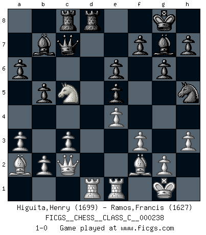 Last move : 1-0 2017 May 1 2:19:49 [Event "FICGS__CHESS__CLASS_C__000238"] [Site "FICGS"] [Date "2016.09.17"] [Round "1"] [White "Higuita,Henry"] [Black "Ramos,Francis"] [Result "1-0"] [WhiteElo "1699"] [BlackElo "1627"] 1.e4 c5 2.Nf3 d6 3.Bc4 e6 4.Nc3 Nc6 5.a3 Nf6 6.d3 a6 7.O-O Be7 8.h3 O-O 9.Ne2 b5 10.Ba2 Bb7 11.Nf4 Re8 12.Re1 Bf8 13.c3 Rc8 14.Be3 Ne5 15.Nxe5 dxe5 16.Ne2 c4 17.f3 cxd3 18.Nc1 Qe7 19.Qxd3 Red8 20.Qc2 g6 21.Nd3 Qc7 22.Rad1 Nh5 23.Bf2 Bg7 24.Nc5 1-0 This chess game has been lost on time (started : 2016.09.17 15:45:1) Sicilian Kingside Castling by player White (move 7) Kingside Castling by player Black (move 8) Player White won this chess game. Follow this game move after move (download)White lost because he failed to remember the right continuation and had to think up the moves himself. (Siegbert Tarrasch) Jeder leidlich begabte Spieler, er braucht keineswegs hervorragend veranlagt zu sein, kann es zum Meister bringen. Aber das ist ja auch gar nicht nötig! Der richtige Standpunkt ist es, zu seinem Vergnügen zu spielen, und man glaube ja nicht, dass der Genuss proportional dem Können sei. (Siegbert Tarrasch) ¿Que sería del Ajedrez sin errores graciosos?. (Kurt Richter) Il s'avisa de me proposer d'apprendre les échecs qu'il jouait un peu... me voilà forcené des échecs. J'achète un échiquier, je m'enferme dans ma chambre, j'y passe des jours et des nuits à vouloir apprendre par cur toutes les parties. (Jean-Jacques Rousseau, Confessions) Depression is just anger without enthusiasm. (Unknown)