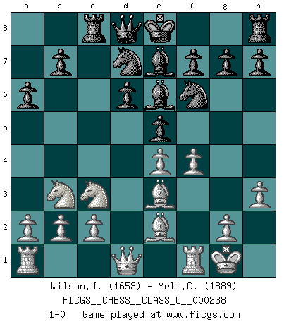 Last move : 1-0 2017 January 10 11:25:41 [Event "FICGS__CHESS__CLASS_C__000238"] [Site "FICGS"] [Date "2016.09.17"] [Round "1"] [White "Wilson,Jaimie"] [Black "Meli,Cosimo Leonardo"] [Result "1-0"] [WhiteElo "1653"] [BlackElo "1889"] 1.e4 c5 2.Nf3 d6 3.d4 cxd4 4.Nxd4 Nf6 5.Nc3 a6 6.h3 e5 7.Nb3 Be6 8.Be2 Be7 9.O-O Nbd7 10.f4 Rc8 11.Be3 1-0 Sicilian : Najdorf, Adams attack Kingside Castling by player White (move 9) Player White won this chess game. Follow this game move after move (download)Play the opening like a book, the middle game like a magician, and the endgame like a machine. (Spielmann) Schach ist ein schwarz-weisser Dschungel. (Garry Kasparov) La vida es como un juego de Ajedrez, cambiando con cada movimiento. (Proverbio Chino) Il a essayé de se convaincre qu'il pourrait empêcher toutes les erreurs et ne jamais perdre. L'horreur ! Gary Kasparov au sujet de Robert Fischer. The age of a woman doesn't mean a thing. The best tunes are played on the oldest fiddles. (Ralph Waldo Emerson)