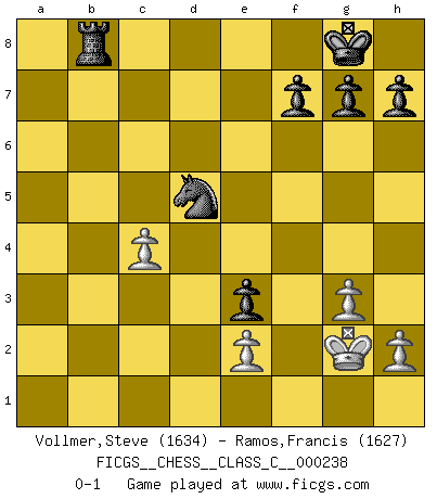 Last move : 0-1 2017 January 5 15:57:6 [Event "FICGS__CHESS__CLASS_C__000238"] [Site "FICGS"] [Date "2016.09.17"] [Round "1"] [White "Vollmer,Steve"] [Black "Ramos,Francis"] [Result "0-1"] [WhiteElo "1634"] [BlackElo "1627"] 1.d4 d5 2.c4 e6 3.Nc3 c5 4.dxc5 d4 5.Ne4 Bxc5 6.Nf3 Nc6 7.g3 e5 8.Bg2 Nf6 9.Nxc5 Qa5+ 10.Bd2 Qxc5 11.Rc1 O-O 12.O-O Bg4 13.a3 a5 14.Qa4 e4 15.Ng5 e3 16.fxe3 dxe3 17.Bc3 Qxg5 18.Rf4 Nh5 19.Rxg4 Qxg4 20.Bf3 Qg6 21.Rd1 Rfd8 22.Rd5 Nf6 23.Rxd8+ Rxd8 24.b4 axb4 25.axb4 Ne4 26.Qc2 Nxc3 27.Qxc3 Qb1+ 28.Kg2 Qxb4 29.Qxb4 Nxb4 30.Bxb7 Rb8 31.Bd5 Nxd5 0-1 QGD : Tarrasch defense Kingside Castling by player Black (move 11) Kingside Castling by player White (move 12) Player Black won this chess game. Follow this game move after move (download)Winning isn't everything... but losing is nothing. (Mednis) Herr Iljumschinow ist ein etwas merkwürdiger Geschäftsmann: Er arbeitet zusammen mit Leuten wie Muammar al-Gaddafi; früher ist das Saddam Hussein gewesen. (Joel Lautier) Uno no tiene que jugar muy bien, es suficiente jugar mejor que el oponente. (Siegbert Tarrasch) Un footballeur joue avec ses pieds, parfois avec sa tête. Un joueur d'échecs ne joue qu'avec sa tête. Et quand il ne joue plus, il meurt. (Jacob Murray) Do you know these so called Volunteers don't even get paid! (Simpsons)