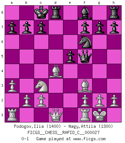 Last move : 0-1 2007 May 13 15:6:44 [Event "FICGS__CHESS__RAPID_C__000027"] [Site "FICGS"] [Date "2007.03.27"] [Round "1"] [White "Podogov,Ilia"] [Black "Nagy,Attila"] [Result "0-1"] [WhiteElo "1400"] [BlackElo "1300"] 1.e4 d5 2.exd5 Qxd5 3.Nc3 Qa5 4.d4 Nf6 5.Nf3 Bg4 6.Be3 Nc6 7.Be2 O-O-O 8.a3 Qf5 9.O-O Bxf3 10.Bxf3 Nxd4 11.Bxd4 e5 0-1 This chess game has been lost on time (started : 2007.03.27 10:42:51) Scandinavian (centre counter) defense Queenside Castling by player Black (move 7) Kingside Castling by player White (move 9) Player Black won this chess game. Follow this game move after move (download)We must make sure that Chess will not be like a dead language, very interesting, but for a very small group. (Sytze Faber) Frage: Was machen Sie mit den Preisen? Anwort: Ich habe Angst, dass meine Freundin davon neue Kleider kauft. (Loek van Wely) Las leyes del Ajedrez no permiten una libre elección: tienes que mover quieras o no. (Emanuel Lasker) Plusieurs personnes se sont demandées comment Tal faisait pour gagner... En fait, c'est très simple ! Il met ses pièces au centre de l'échiquier et les sacrifie quelque part ! (David Bronstein) If we knew what we were doing, we would not call it research. (Albert Einstein)