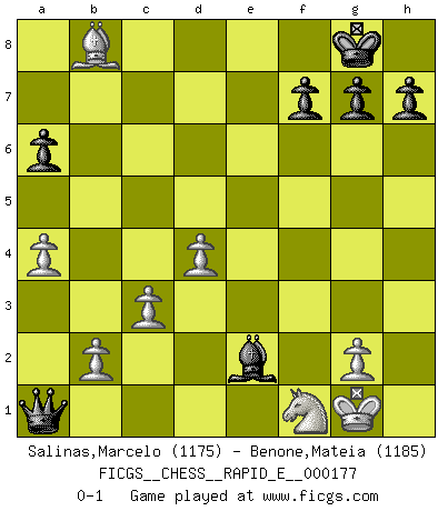 Last move : 0-1 2016 December 24 9:15:21 [Event "FICGS__CHESS__RAPID_E__000177"] [Site "FICGS"] [Date "2016.09.22"] [Round "1"] [White "Salinas,Marcelo"] [Black "Benone,Mateia"] [Result "0-1"] [WhiteElo "1175"] [BlackElo "1185"] 1.e4 e5 2.Bc4 Nf6 3.Qf3 c6 4.Qb3 d5 5.exd5 cxd5 6.Bb5+ Nc6 7.Nf3 Bd6 8.O-O e4 9.Nd4 O-O 10.Bxc6 bxc6 11.Nxc6 Qc7 12.Nd4 Bxh2+ 13.Kh1 Be5 14.Nb5 Qd7 15.a4 Rb8 16.f4 exf3 17.Qxf3 d4 18.Qe2 Re8 19.c3 d3 20.Qf2 a6 21.Nd4 Ng4 22.Qf3 Nh2 23.Qxd3 Nxf1 24.Qxf1 Bg3 25.Ne2 Qd3 26.Nxg3 Qxg3 27.d4 Re1 28.Nd2 Rxf1+ 29.Nxf1 Qe1 30.Kg1 Bg4 31.Bf4 Qxa1 32.Bxb8 Be2 0-1 This chess game has been lost on time (started : 2016.09.22 19:47:32) Bishop's Opening : Berlin defense Kingside Castling by player White (move 8) Kingside Castling by player Black (move 9) Player Black won this chess game. Follow this game move after move (download)A Chess game is a dialogue, a conversation between a player and his opponent. Each move by the opponent may contain threats or be a blunder, but a player cannot defend against threats or take advantage of blunders if he does not first ask himself: What is my opponent planning after each move ? (Bruce A. Moon) Mein Gehirn das ist mein zweitwichtigstes Organ [Aus dem Film: Der Schläfer]. (Woody Allen) No nos podemos resistir a la fascinación de un sacrificio ya que la pasión por los sacrificios es parte de la naturaleza de un jugador de Ajedrez. (Rudolf Spielman) Comme les marins qui ont mille raisons différentes d'aller en mer, les joueurs d'échecs en ont tout autant avant de s'installer devant une table et jouer... (Vincent Bertignac, philosophe) The problem with manipulation is that people can turn on you. (Horatio Caine, C.S.I. Miami)