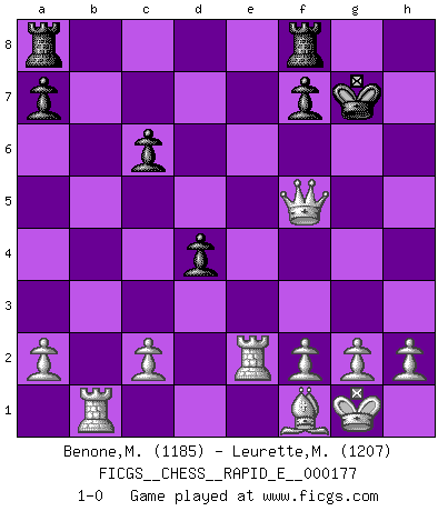 Last move : 1-0 2016 October 27 17:42:24 [Event "FICGS__CHESS__RAPID_E__000177"] [Site "FICGS"] [Date "2016.09.22"] [Round "1"] [White "Benone,Mateia"] [Black "Leurette,Marc-Antoine"] [Result "1-0"] [WhiteElo "1185"] [BlackElo "1207"] 1.e4 e5 2.Nf3 Nc6 3.d4 exd4 4.Nxd4 Nf6 5.Nc3 Bb4 6.Nxc6 bxc6 7.Bd3 d5 8.exd5 cxd5 9.O-O O-O 10.Bg5 c6 11.Qf3 Bxc3 12.bxc3 Be6 13.Rab1 h6 14.Be3 Ne4 15.Rfe1 Nxc3 16.Rb7 d4 17.Bxh6 Qd6 18.Bxg7 Kxg7 19.Qh5 Bf5 20.Qxf5 Qh6 21.Re6 Qc1+ 22.Bf1 Ne2+ 23.Rxe2 Qb1 24.Rxb1 1-0 Scotch : Schmidt variation Kingside Castling by player White (move 9) Kingside Castling by player Black (move 9) Player White won this chess game. Follow this game move after move (download)Chess is like war on a board. (Bobby Fischer) Es gibt nur zwei wahre Schachgenies - das andere war Wilhelm Steinitz, der Weltmeister von 1872 bis 1894. (Robert James Fischer) El Ajedrez es el gimnasio de la mente. (Blaise Pascal) Horreur, mais aussi harmonie suprême : qu'y avait-il en effet au monde en dehors des échecs ? Le brouillard, l'inconnu, le non-être... (Vladimir Nabokov) True nature is revealed in times of difficulty. (Chinese proverb)