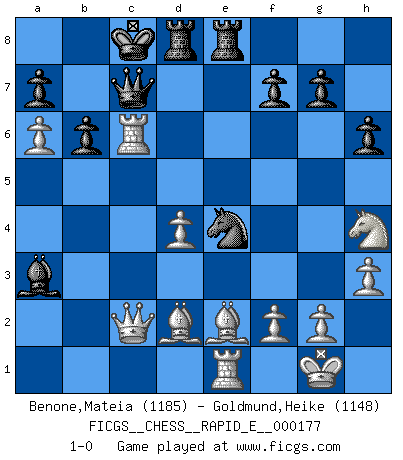 Last move : 1-0 2016 November 21 19:15:50 [Event "FICGS__CHESS__RAPID_E__000177"] [Site "FICGS"] [Date "2016.09.22"] [Round "1"] [White "Benone,Mateia"] [Black "Goldmund,Heike"] [Result "1-0"] [WhiteElo "1185"] [BlackElo "1148"] 1.e4 d5 2.exd5 Qxd5 3.Nc3 Qa5 4.d4 Bf5 5.Nf3 c6 6.Bd2 e6 7.Be2 Nf6 8.O-O Qc7 9.Re1 Bd6 10.h3 Nbd7 11.Nh4 Bg6 12.a4 O-O-O 13.a5 Nd5 14.Nxd5 exd5 15.b4 Be4 16.c4 h6 17.cxd5 Bxd5 18.b5 Rhe8 19.bxc6 Bxc6 20.Rc1 Ba3 21.Rc4 Nf6 22.a6 b6 23.Qc2 Ne4 24.Rxc6 1-0 Scandinavian (centre counter) defense Kingside Castling by player White (move 8) Queenside Castling by player Black (move 12) Player White won this chess game. Follow this game move after move (download)My opponents make good moves too. Sometimes I don't take these things into consideration. (Bobby Fischer) Es gibt keine einzige Frau, der ich nicht einen Springer vorgeben könnte und trotzdem gewänne. (Robert James Fischer) El Ajedrez es la vida. (Bobby Fischer) Tous ces prétendus hommes politiques sont les pions, les Cavaliers, les Tours ou les Fous d'une partie d'échecs qui se jouera tant qu'un hasard ne renversera pas l'échiquier. (Honoré de Balzac) No enterprise is more likely to succeed than one concealed from the enemy until it is ripe for execution. (Niccolo Machiavelli)
