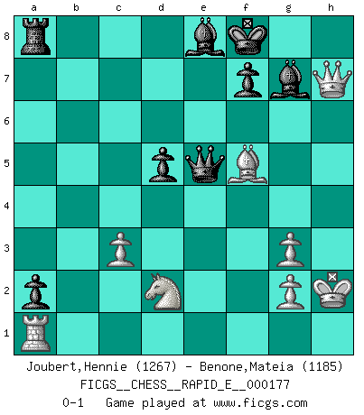 Last move : 0-1 2017 February 1 10:15:7 [Event "FICGS__CHESS__RAPID_E__000177"] [Site "FICGS"] [Date "2016.09.22"] [Round "1"] [White "Joubert,Hennie"] [Black "Benone,Mateia"] [Result "0-1"] [WhiteElo "1267"] [BlackElo "1185"] 1.e4 c5 2.Nf3 g6 3.d4 cxd4 4.Qxd4 Nf6 5.Bc4 Nc6 6.Qd3 Bg7 7.O-O Ne5 8.Nxe5 O-O 9.Nf3 d6 10.Bg5 h6 11.Bh4 g5 12.Bg3 Nh5 13.c3 Bd7 14.Nbd2 a6 15.Rad1 b5 16.Bb3 Nxg3 17.hxg3 Qc7 18.Rfe1 Rfd8 19.Qe3 e6 20.Bc2 b4 21.Nb1 Rab8 22.Bb3 a5 23.e5 d5 24.Bc2 bxc3 25.bxc3 Rb2 26.Bd3 Rxa2 27.Nxg5 hxg5 28.Qxg5 Ba4 29.Rd2 Ra1 30.Qh5 Be8 31.Qh7+ Kf8 32.f4 a4 33.Kh2 Qe7 34.Rde2 a3 35.f5 exf5 36.Bxf5 a2 37.Nd2 Rxe1 38.Rxe1 Ra8 39.Ra1 Qxe5 0-1 Sicilian : Hungarian variation Kingside Castling by player White (move 7) Kingside Castling by player Black (move 8) Player Black won this chess game. Follow this game move after move (download)It is not a move, even the best move that you must seek, but a realizable plan. (Eugene Znosko-Borovsky) Dass jemand wie Surab Asmaiparaschwili, der selbst Elopunkte gekauft hat , Vize-Präsident der Fide werden konnte, sagt schon einges über den Zustand dieser Organisation aus. (Joel Lautier) El Ajedrez por encima de todo... ¡es una pelea!. (Emanuel Lasker) Aidez vos pièces, elles vous aideront. (Paul Morphy) There are two kinds of people in the world, my friend. Those who have a loaded gun and those who dig. You dig ! (Blondie in The Good, The Bad and The Ugly)