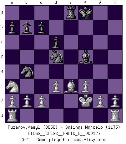 Last move : 0-1 2016 December 22 15:57:31 [Event "FICGS__CHESS__RAPID_E__000177"] [Site "FICGS"] [Date "2016.09.22"] [Round "1"] [White "Puzanov,Vasyl"] [Black "Salinas,Marcelo"] [Result "0-1"] [WhiteElo "0858"] [BlackElo "1175"] 1.e4 f5 2.exf5 Nf6 3.Be2 g6 4.fxg6 hxg6 5.Bd3 Rh6 6.Nf3 e5 7.Nxe5 Qe7 8.Qe2 d6 9.Bxg6+ Rxg6 10.Nxg6 Qxe2+ 11.Kxe2 Bg4+ 12.f3 Bf5 13.Nxf8 Kxf8 14.d3 Nc6 15.Be3 Re8 16.Kf2 Nb4 17.Na3 Nfd5 0-1 Fred Player Black won this chess game. Follow this game move after move (download)Strategy requires thought, tactics require observation. (Max Euwe) Über die Verhaftung Bobby Fischers: Warum es die Bush-Administration für nötig befindet einen 61 Jahre alten Mann zu hetzten, der für niemanden ausser sich selbste eine Gefahr darstellt ist ein Rätsel. (Nigel Short) La esencia del Ajedrez es pensar acerca de lo que el Ajedrez es. (David Bronstein) Tout change constamment, y compris dans le monde des Echecs. (Botvinnik) Better than a thousand days of diligent study is one day with a great teacher. (Japanese proverb)