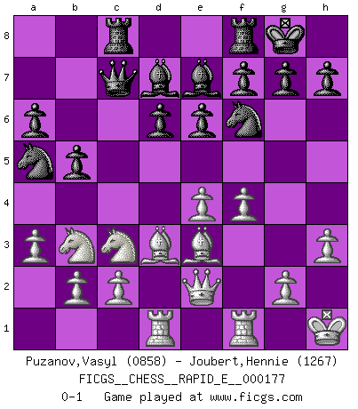 Last move : 0-1 2016 November 16 4:48:16 [Event "FICGS__CHESS__RAPID_E__000177"] [Site "FICGS"] [Date "2016.09.22"] [Round "1"] [White "Puzanov,Vasyl"] [Black "Joubert,Hennie"] [Result "0-1"] [WhiteElo "0858"] [BlackElo "1267"] 1.e4 c5 2.Nf3 e6 3.d4 cxd4 4.Nxd4 Nf6 5.Nc3 Qb6 6.Nb3 Nc6 7.Bd3 a6 8.Be3 Qc7 9.O-O d6 10.h3 Be7 11.f4 Bd7 12.Kh1 O-O 13.Qe2 Rac8 14.a3 b5 15.Rad1 Na5 0-1 This chess game has been lost on time (started : 2016.09.22 19:47:32) Sicilian : Anderssen variation Kingside Castling by player White (move 9) Kingside Castling by player Black (move 12) Player Black won this chess game. Follow this game move after move (download)Castle early and often. (Rob Sillars) Ivan Sokolov treibt mich als Beifahrer an mit go Loeky go - . (Loek van Wely) Ciertamente, de todas la drogas del mundo, el Ajedrez debe ser el mas placentero permamentemente. (Assiac) Les Echecs sont affaire de jugement sensible. Savoir quand frapper et quand esquiver. (Fischer) Panic is a sudden desertion of us, an a going over to the enemy of our imagination. (Christian Nevell Bovee)